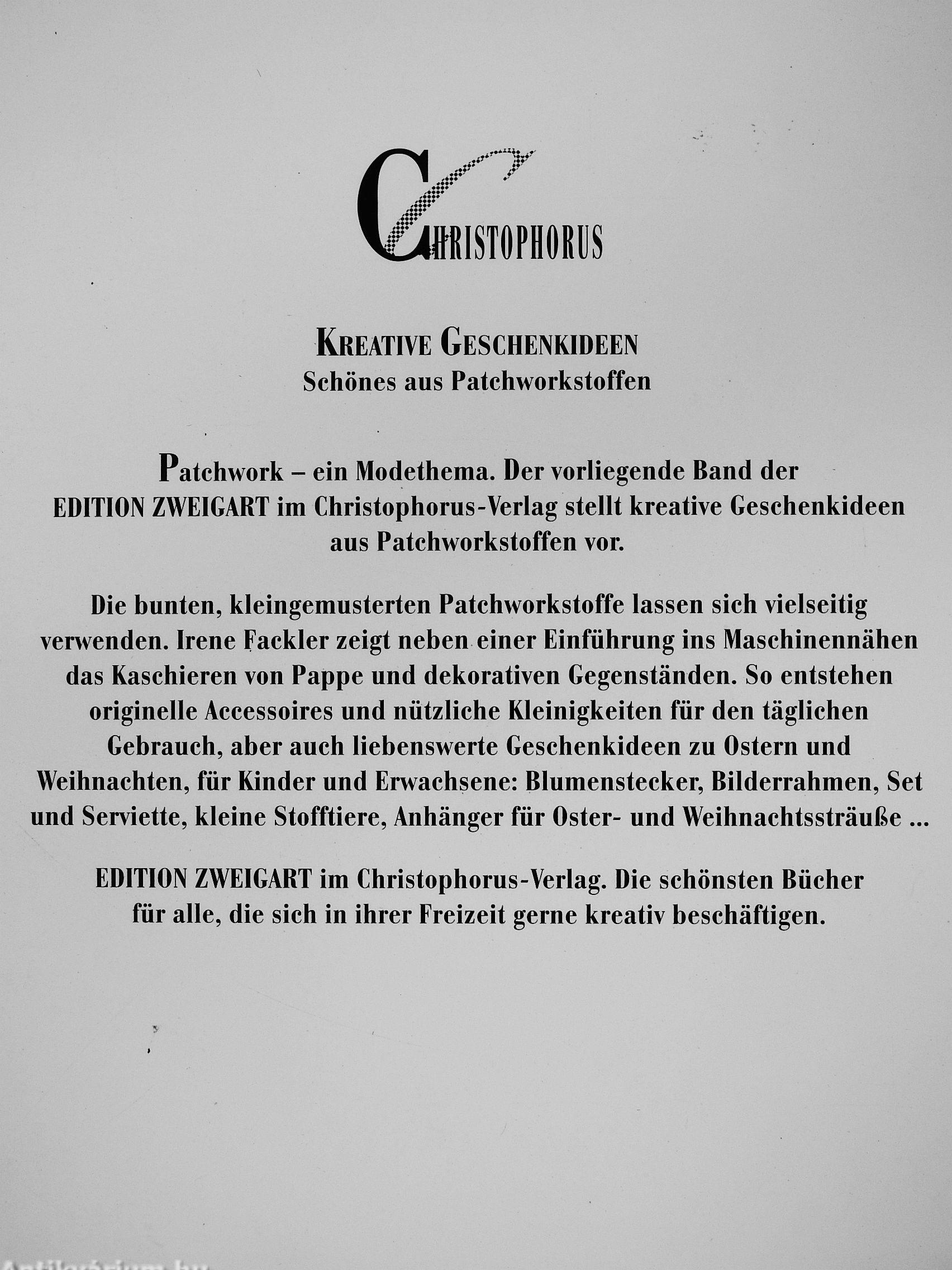 Die bunten, kleingemusterten Patchworkstoffe lassen sich vielseitig verwenden. Irene Fackler zeigt neben einer Einführung ins Maschinennähen das Kaschieren von Pappe und dekorativen Gegenständen. So entstehen originelle Accessoires und nützliche Kleinigkeiten für den täglichen Gebrauch, aber auch liebenswerte Geschenkideen zu Ostern und Weihnachten, für Kinder und Erwachsene: Blumenstecker, Bilderrahmen, Set und Serviette, kleine Stofftiere, Anhänger für Oster- und Weihnachtssträuße