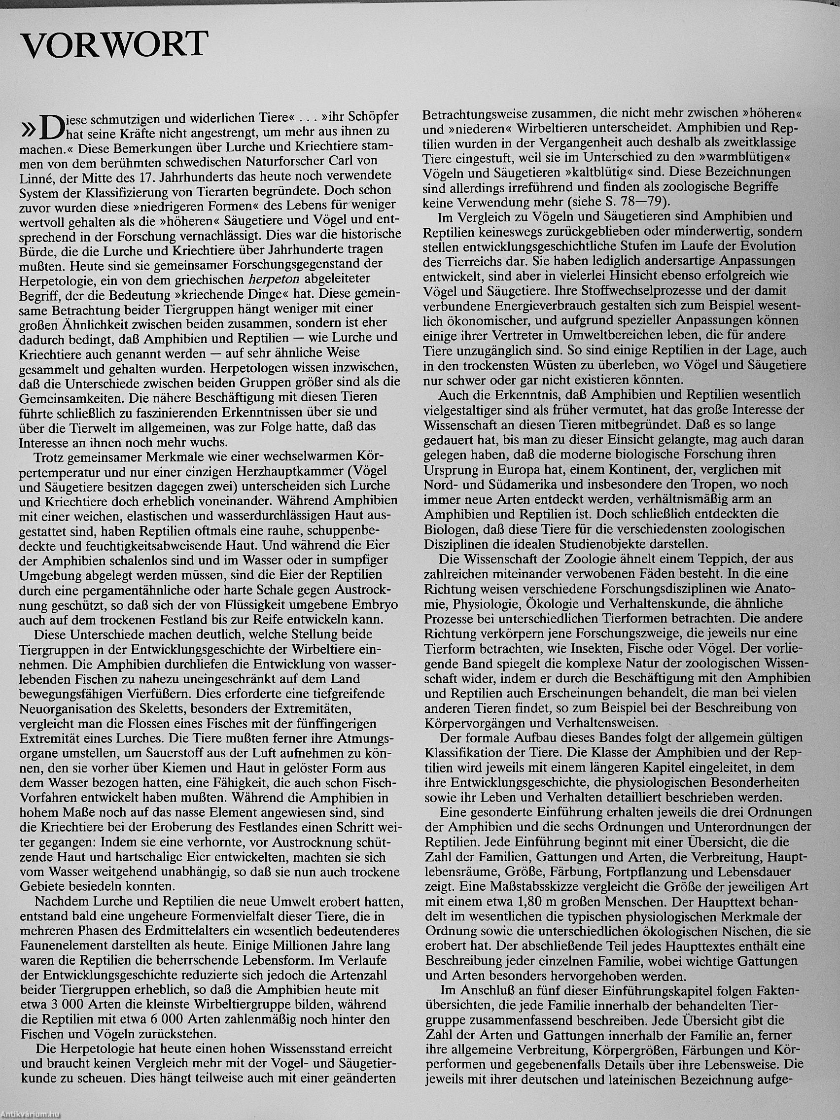 Worum treffen donn Kriechtiere und Lurche trotzdem auf so entschiedene Ablehnung bei Vielen Menschen? Liegt es an ihrer geringen Größe, die sie in der Tat ols vor uns kriechend erscheinen läßt? Oder liegt es an ihrer »glitschigen« Hout, diejo nur Vertreter der einen Klosse aufweisen? Beide Gründe erscheinen nur vorgeschoben, denn in Wohr-heit entspringt die Ablehnung dieser Tiere wieder einmol der Unwissenheit. Nur sie erlaubte ollzu fontasiereiche Märchen und Geschichten über die Tiere, die der Mensch mit aller Abscheu verachtete. Selbst viele sogenonnte Liebhaber beschäftigten sich mit Amphibien oder Reptilien nur desholb, weil sie ihren Zeitgenossen domit Angstschauer bereiten und sich selbst als unerschrockenen Böndiger der »widerlichsten Kreatur« feiern lassen konnten.