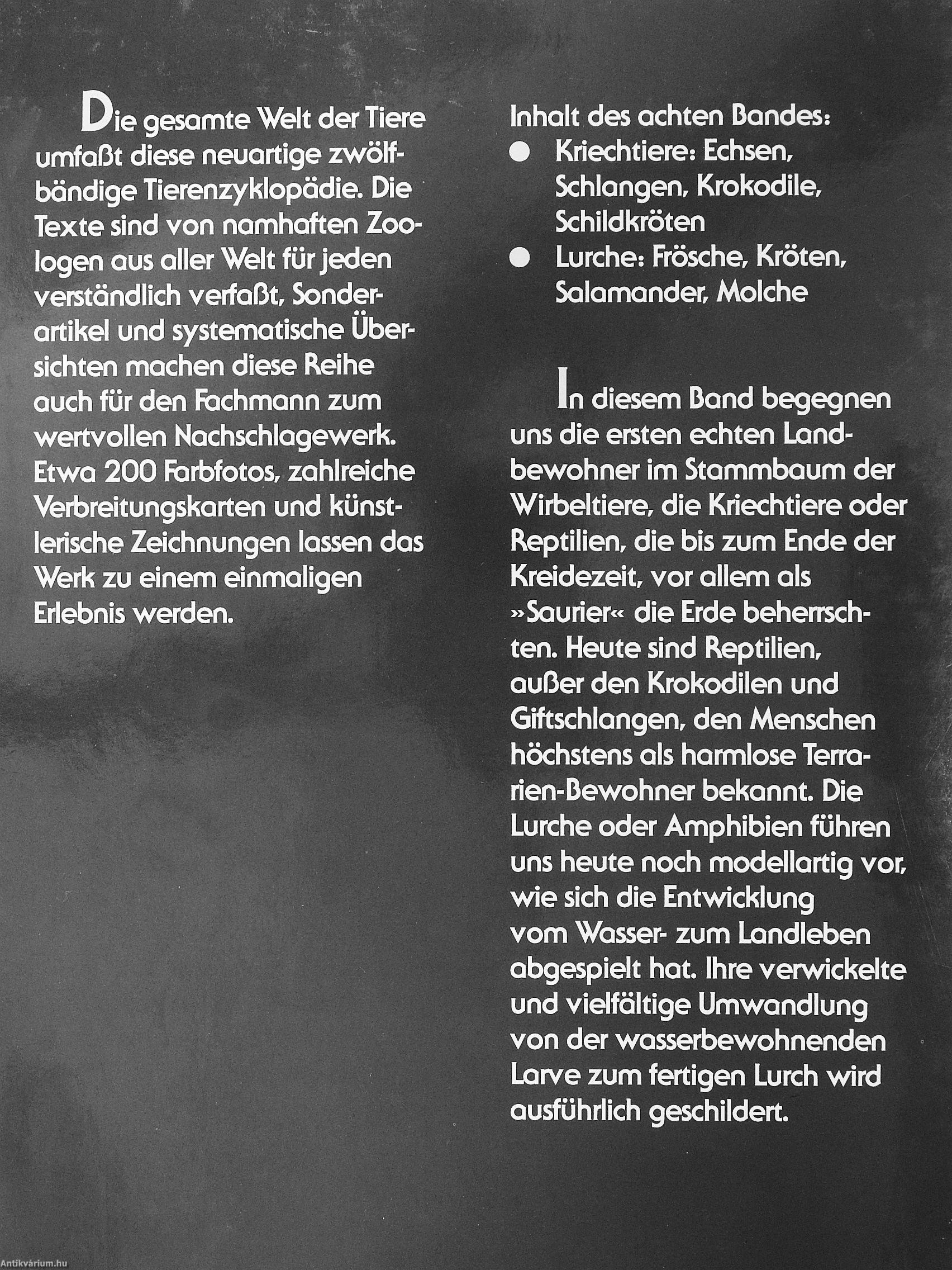 Die gesamte Welt der Tiere umfaßt diese neuartige zwölfbändige Tierenzyklopädie. Die Texte sind von nomhoften Zoologen aus oller Welt für jeden verständlich verfaßt, Sonderartikel und systematische Übersichten machen diese Reihe auch für den Fachmann zum wertvollen Nachschlagewerk. Etwa 200 Fbrbfotos, zahlreiche Verbreitungskarten und künstlerische Zeichnungen lassen dos Werk zu einem einmaligen Erlebnis werden.