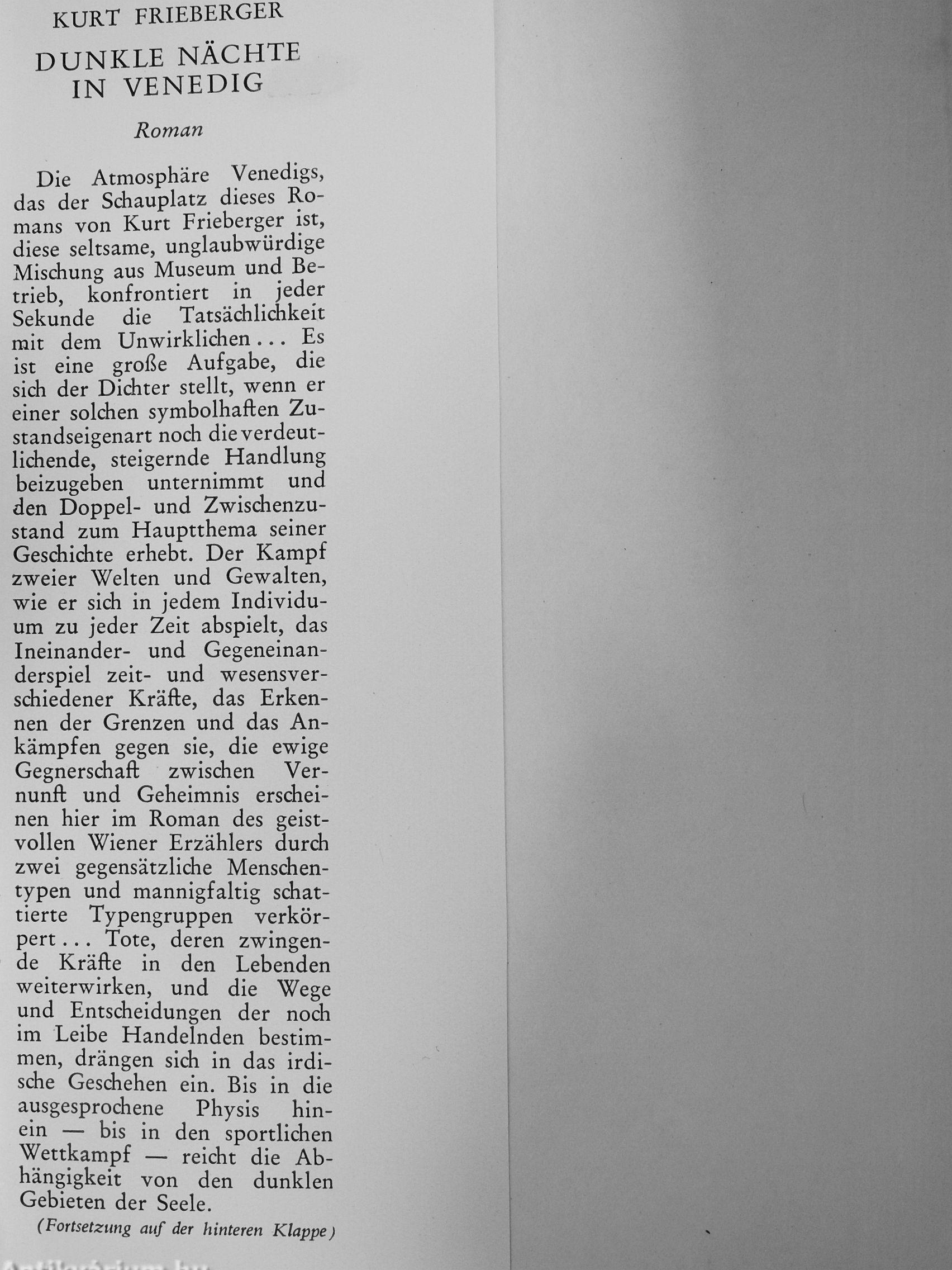 Die Atmosphäre Venedigs, das der Schauplatz dieses Romans von Kurt Frieberger ist, diese seltsame, unglaubwürdige Mischung aus Museum und Betrieb, konfrontiert in jeder Sekunde die Tatsächlichkeit mit dem Unwirklichen Es ist eine große Aufgabe, die sich der Dichter stellt, wenn er einer solchen symbolhaften Zu-standseigenart noch die verdeutlichende, steigernde Handlung beizugeben unternimmt und den Doppel- und Zwischenzustand zum Hauptthema seiner Gesdiidite erhebt. Der Kampf zweier Welten und Gewalten, wie er sich in jedem Individuum zu jeder Zeit abspielt, das Ineinander- und Gegeneinan-dersplel zeit- und wesensverschiedener Kräfte, das Erkennen der Grenzen und das Ankämpfen gegen sie, die ewige Gegnerschaft zwischen Vernunft und Geheimnis erscheinen hier im Roman des geistvollen Wiener Erzählers durch zwei gegensätzliche Menschentypen und mannigfaltig schattierte Typengruppen verkörpert Tote, deren zwingende Kräfte in den...