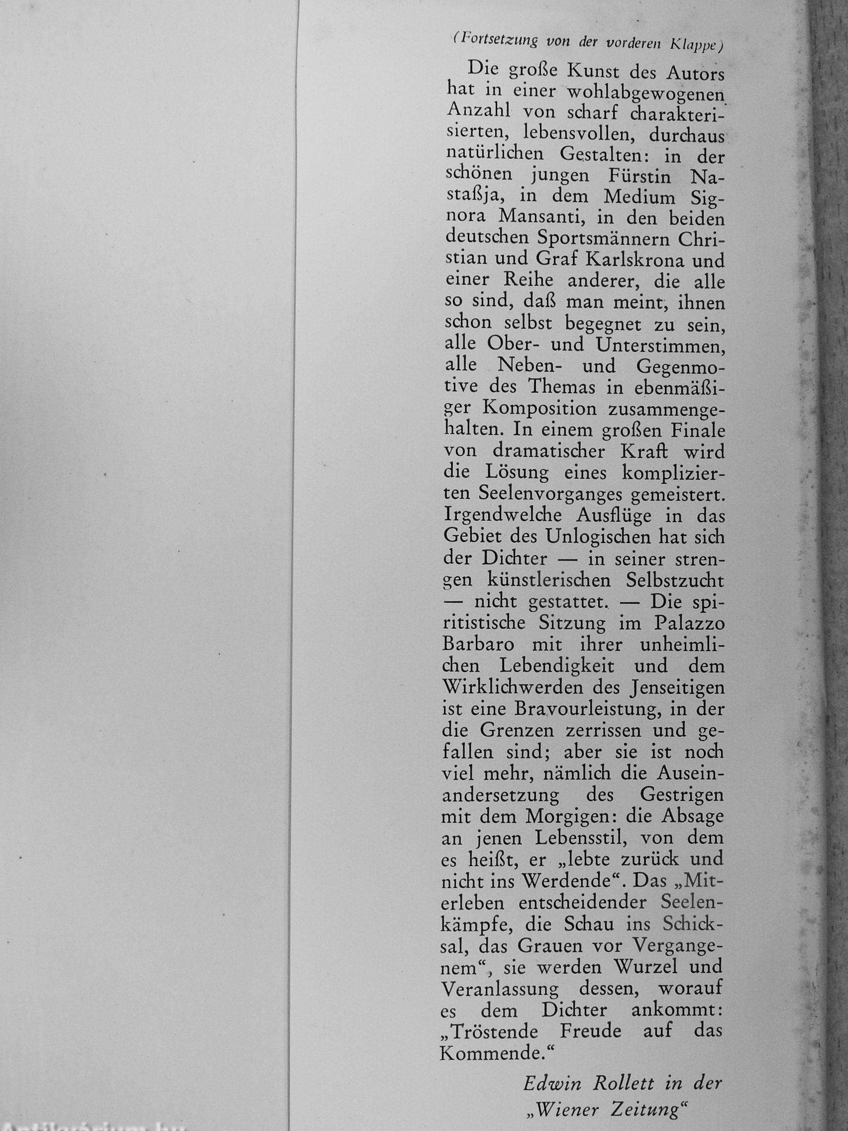 Die große Kunst des Autors iiat in einer wohlabgewogenen Anzahl von scharf charakterisierten, lebensvollen, durchaus natürlichen Gestalten: in der schönen jungen Fürstin Na-staßja, in dem Medium Sig-nora Mansanti, in den beiden deutschen Sportsmännern Christian und Graf Karlskrona und einer Reihe anderer, die alle so sind, daß man meint, ihnen schon selbst begegnet zu sein, alle Ober- und Unterstimmen, alle Neben- und Gegenmotive des Themas in ebenmäßiger Komposition zusammengehalten. In einem großen Finale von dramatischer Krafl wird die Lösung eines komplizierten Seelenvorganges gemeistert. Irgendwelche Ausflüge in das Gebiet des Unlogisdien hat sich der Dichter — in seiner strengen künstlerischen Selbstzucht — nicht gestattet. — Die spiritistische Sitzung im Palazzo Barbaro mit ihrer unheimlichen Lebendigkeit und dem Wirklichwerden des Jenseitigen ist eine Bravourleistung, in der die Grenzen zerrissen und gefallen sind; aber sie ist noch viel mehr, nämlich die Auseinandersetzung des Gestrigen mit dem Morgigen: die Absage an jenen Lebensstil, von dem es heißt, er „lebte zurück und nicht ins Werdende". Das „Miterleben entscheidender Seelenkämpfe, die Schau ins Schicksal, das Grauen vor Vergangenem", sie werden Wurzel und Veranlassung dessen, worauf es dem Dichter ankommt: „Tröstende Freude auf das Kommende."