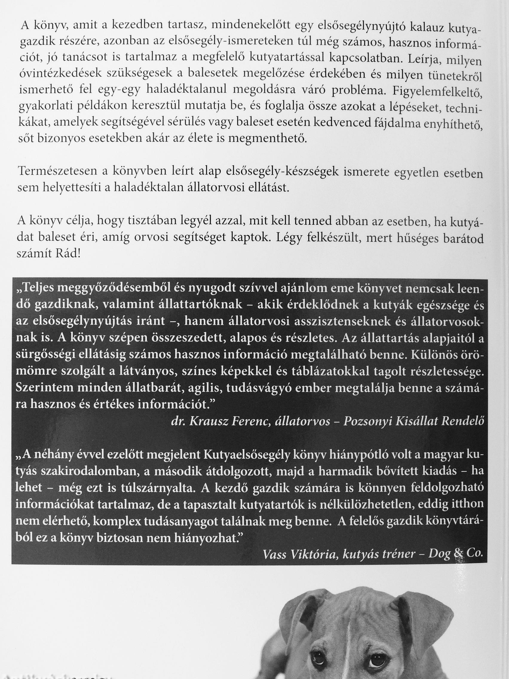 „A néhány évvel ezelőtt megjelent Kutyaelsősegély könyv hiánypótló volt a magyar kutyás szakirodalomban, a második átdolgozott, majd a harmadik bővített kiadás - ha lehet - még ezt is túlszárnyalta. A kezdő gazdik számára is könnyen feldolgozható információkat tartalmaz, de a tapasztalt kutyatartók is nélkülözhetetlen, eddig itthon nem elérhető, komplex tudásanyagot találnak meg benne. A felelős gazdik könyvtárából ez a könyv biztosan nem hiányozhat."
