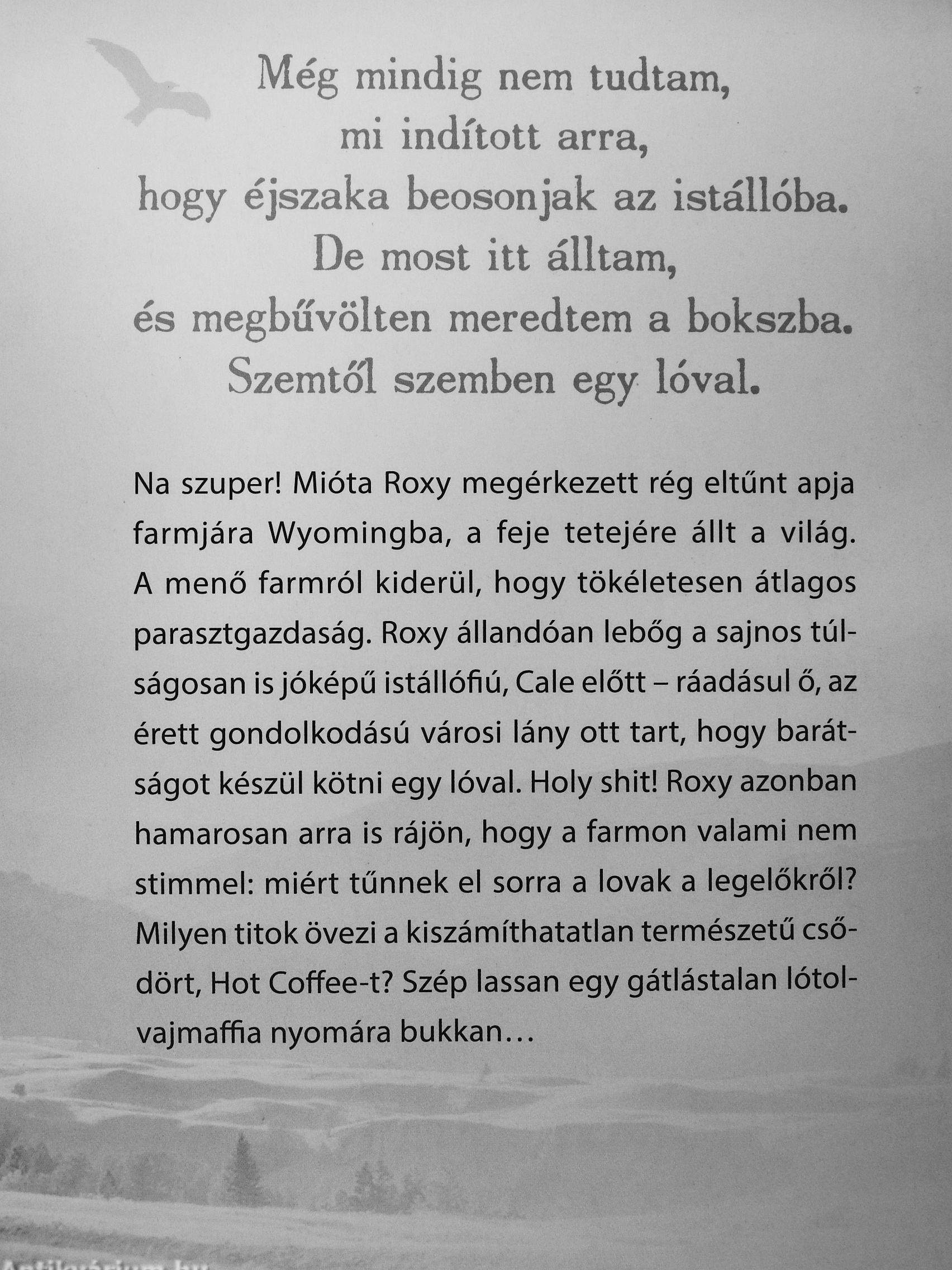 Na szuper! Mióta Roxy megérkezett rég eltűnt apja farmjára Wyomingba, a feje tetejére állt a világ. A menő farmról kiderül, hogy tökéletesen átlagos parasztgazdaság. Roxy állandóan lebőg a sajnos túlságosan is jóképű istállófiú, Cale előtt - ráadásul ő, az érett gondolkodású városi lány ott tart, hogy barátságot készül kötni egy lóval. Holy shit! Roxy azonban hamarosan arra is rájön, hogy a farmon valami nem stimmel: miért tűnnek el sorra a lovak a legelőkről? Milyen titok övezi a kiszámíthatatlan természetű csődört, Hot Coffee-t? Szép lassan egy gátlástalan lótol-vajmaffia nyomára bukkan