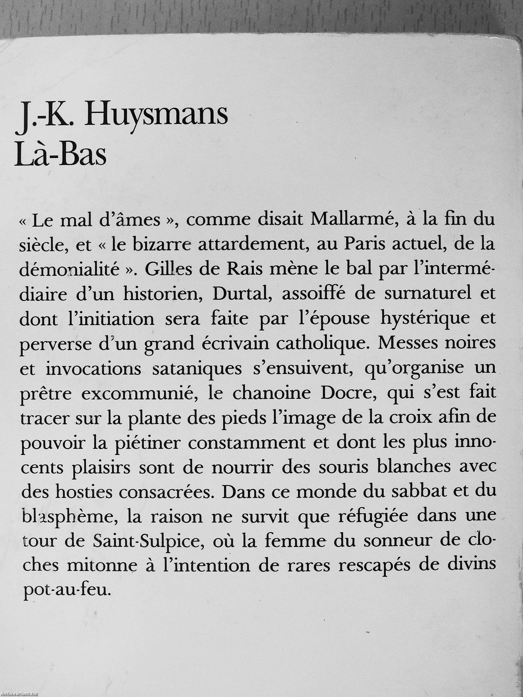 « Le mal d'âmes », comme disait Mallarmé, a la fin du siecle, et « le bizarre attardement, au Paris actuel, de la démonialité ». Gilles de Rais mene le bal par l'intermédiaire d'un historien, Durtal, assoiffé de surnaturel et dont l'initiation sera faite par l'épouse hystérique et perverse d'un grand écrivain catholique. Messes noires et invocations sataniques s'ensuivent, qu'organise un pretre excommunié, le chanoine Docre, qui s'est fait tracer sur la plante des pieds l'image de la croix afin de pouvoir la piétiner constamment et dont les plus iimo-cents plaisirs sont de nourrir des souris blanches avec des hosties consacrées. Dans ce monde du sabbat et du bl ispheme, la raison ne survit que réfugiée dans une tour de Saint-Sulpice, ou la femme du sonneur de cloches mitonne a l'intention de rares rescapés de divins pot-au-feu.