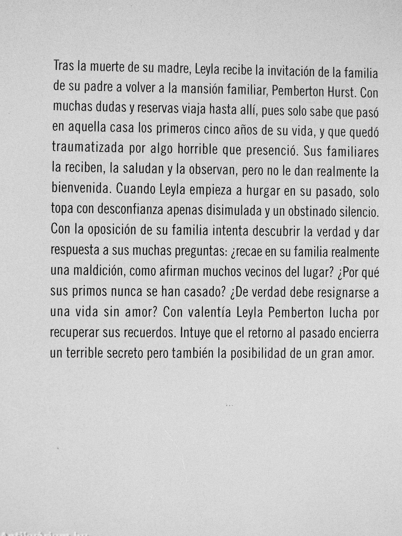 Tras la muerte de su madre, Leyia recibe la invitación de la familia de su padre a volver a la mansión familiar, Pemberton Hurst. Con muchas dudas y reservas viaja hasta allí, pues solo sabe que pasó en aquella casa los primeros cinco anos de su vida, y que quedó traumatizada por algo horrible que presenció. Sus familiares la reciben, la saludan y la observan, pero no le dan realmente la bienvenida. Cuando Leyia empieza a hurgar en su pasado, solo topa con desconfianza apenas disimulada y un obstinado silencio. Con la oposición de su familia intenta descubrir la verdad y dar respuesta a sus muchas preguntas: ?recae en su familia realmente una maldición, como afirman muchos vecinos del lugar? ?Por qué sus primos nunca se han casado? ?De verdad debe resignarse a una vida sin amor? Con valentía Leyia Pemberton lucha por recuperar sus recuerdos. Intuye que el retorno al pasado encierra un terrible secreto pero también la posibilidad de un gran amor.
