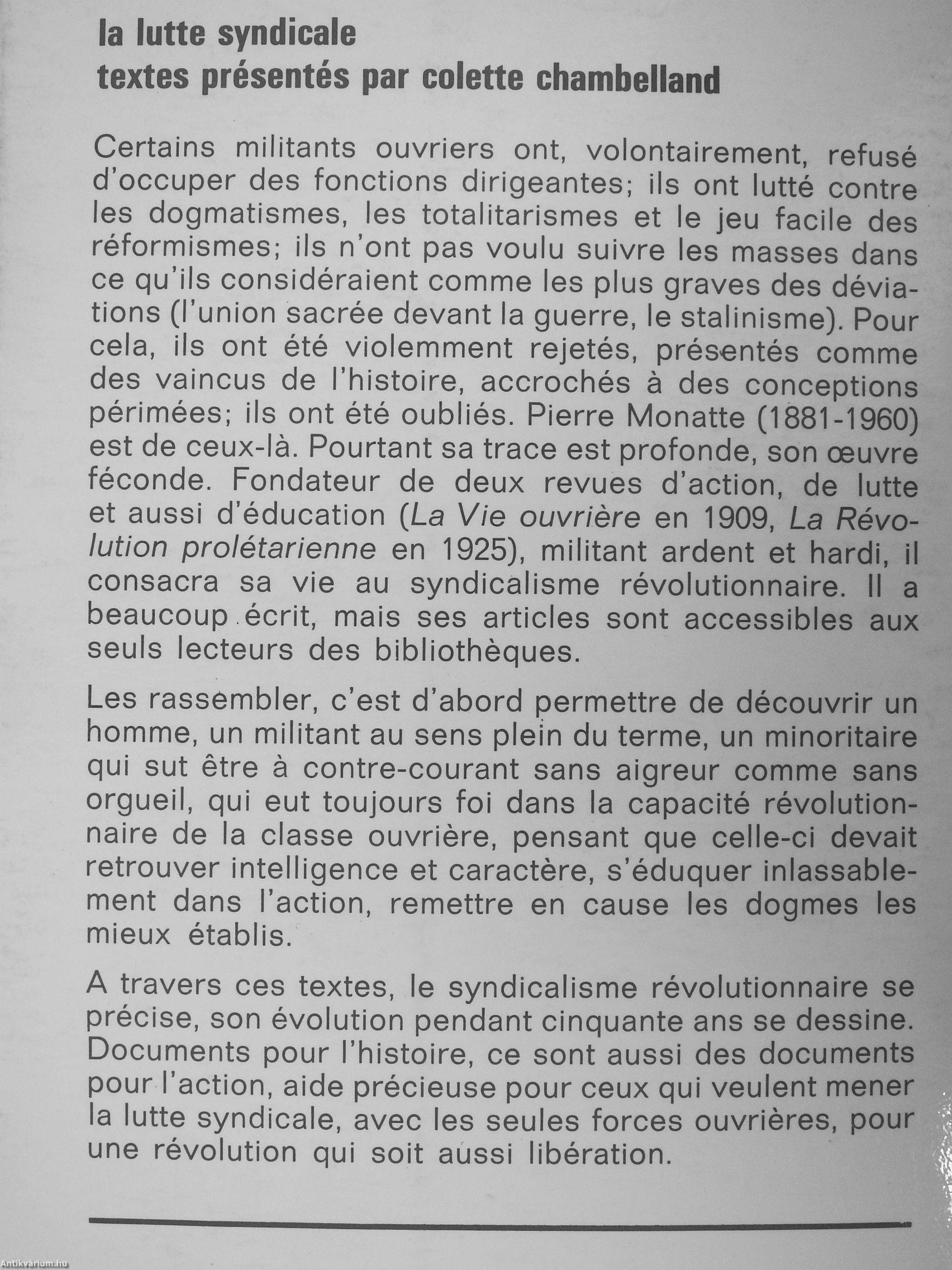 Certains militants ouvriers ont, volontairement, refusé d'occuper des fonctions dirigeantes; ils ont lutté contre les dogmatismes, les totalitarismes et le jeu facile des réformismes; ils n'ont pas voulu suivre les masses dans ce qu'ils considéraient comme les plus graves des déviations (l'union sacrée devant la guerre, le stalinisme). Pour cela, ils ont été violemment rejetés, présentés comme des vaincus de l'histoire, accrochés a des conceptions périmées; ils ont été oubliés. Pierre Monatte (1881-1960) est de ceux-la. Pourtant sa trace est profonde, son ouvre féconde. Fondateur de deux revues d'action, de lutte et aussi d'éducation (La Vie ouvriere en 1909, La Révolution prolétarienne en 1925), militant ardent et hardi, il consacra sa vie au syndicalisme révolutionnaire. Il a beaucoup écrit, mais ses articles sont accessibles aux seuls lecteurs des bibliotheques.