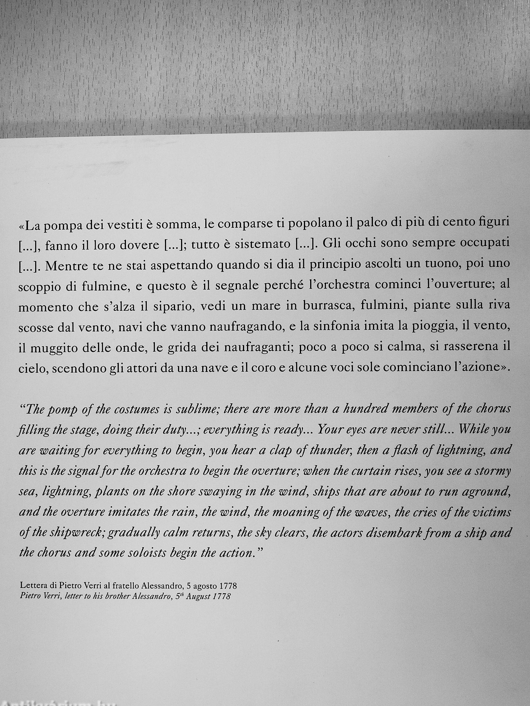 «La pompa dei vestid é somma, le comparse ti popolano il palco di piü di cento figuri [ ], fanno il loro dovere [ ]; tutto é sistemato [ ]. Gli occhi sono sempre occupati [ ]. Mentre te ne stai aspettando quando si día il principio ascolti un tuono, poi uno scoppio di fulmine, e questo é il segnale perché l'orchestra cominci l'ouverture; al momento che s'alza il sipario, vedi un mare in burrasca, fulmini, piante sulla riva scosse dal vento, navi che vanno naufragando, e la sinfonía imita la pioggia, il vento, il muggito delle onde, le grida dei naufraganti; poco a poco si calma, si rasserena il cielo, scendono gli attori da una nave e il coro e alcune voci sole cominciano l'azione».