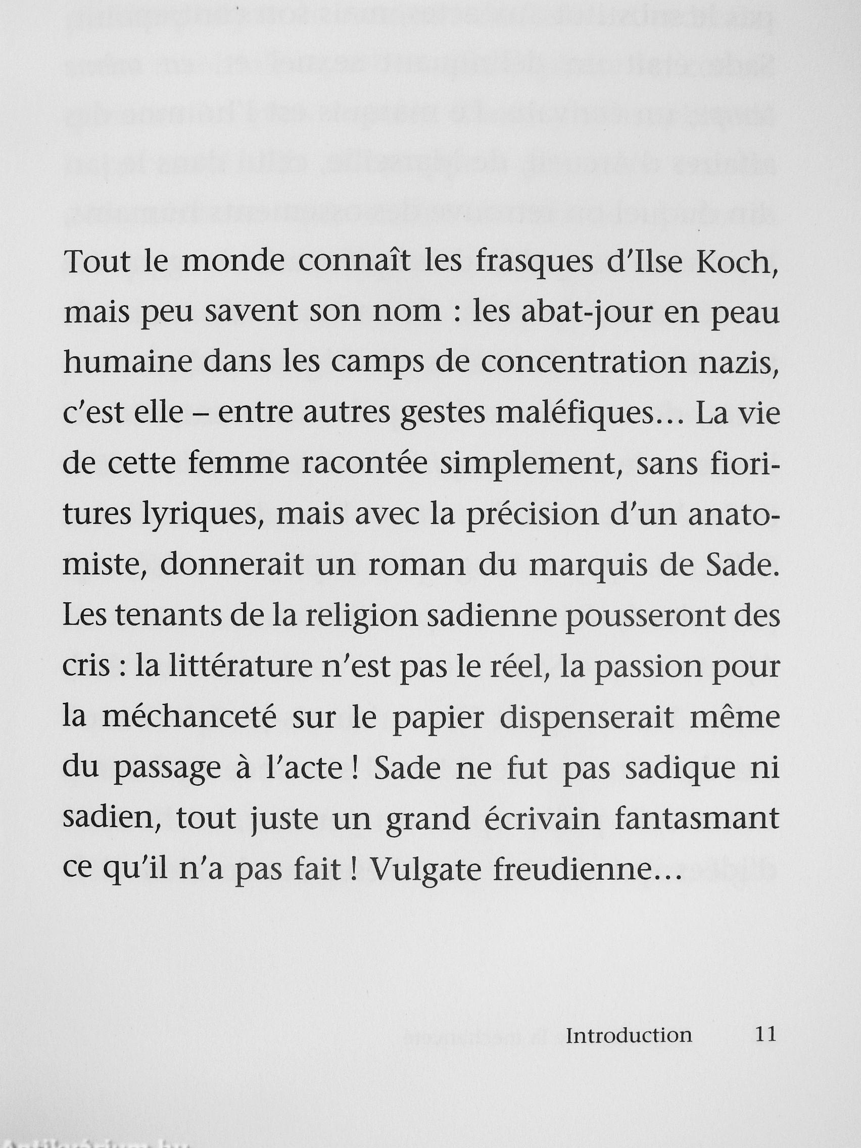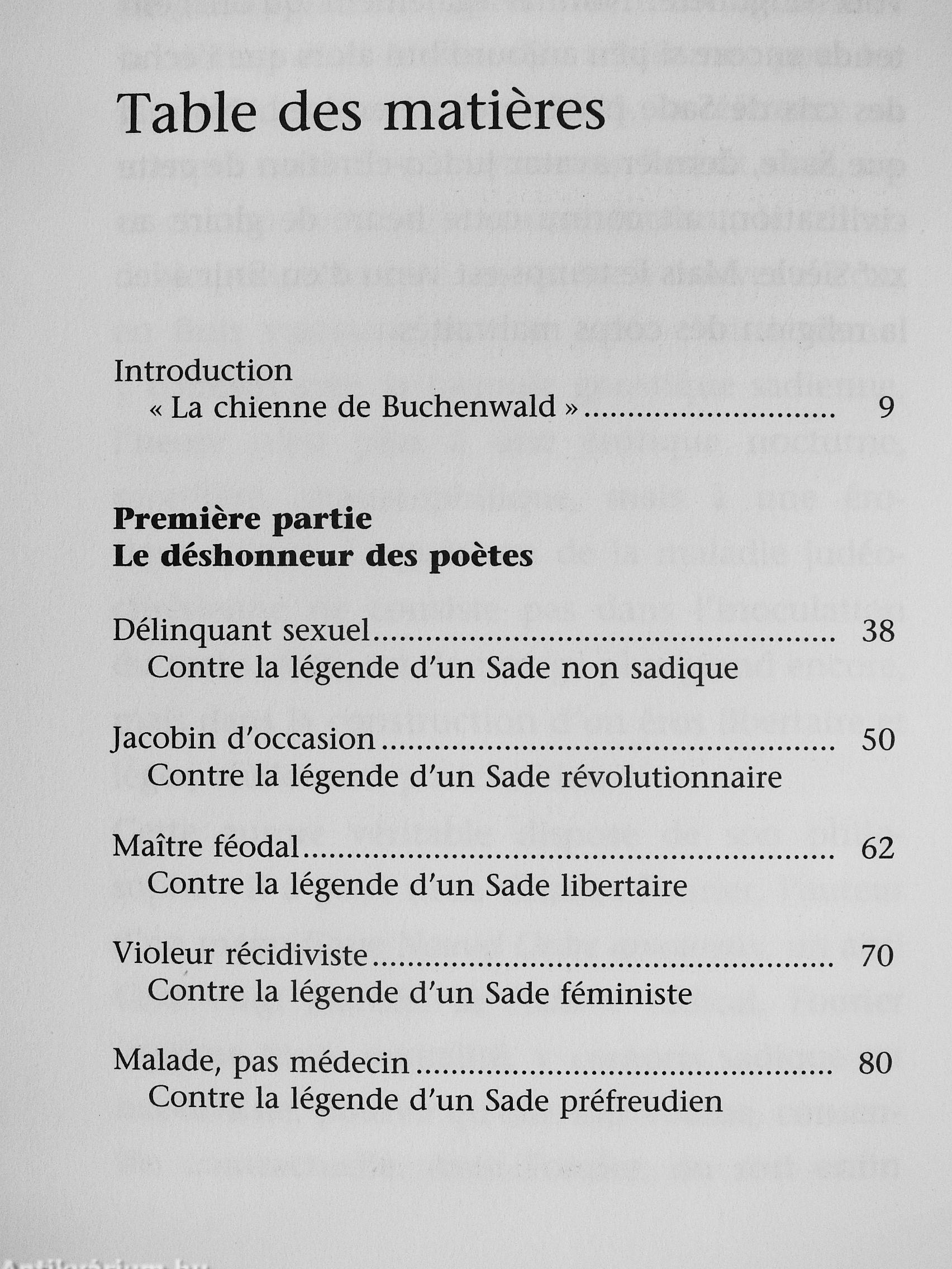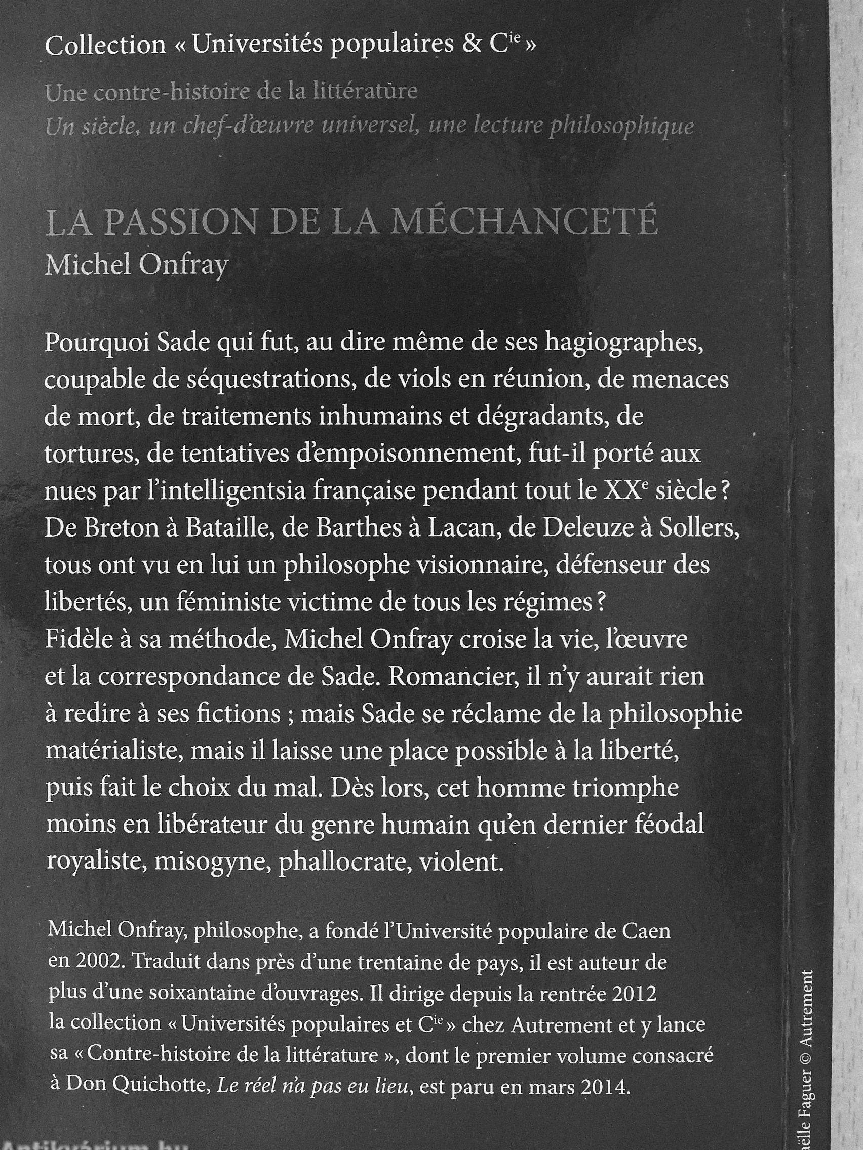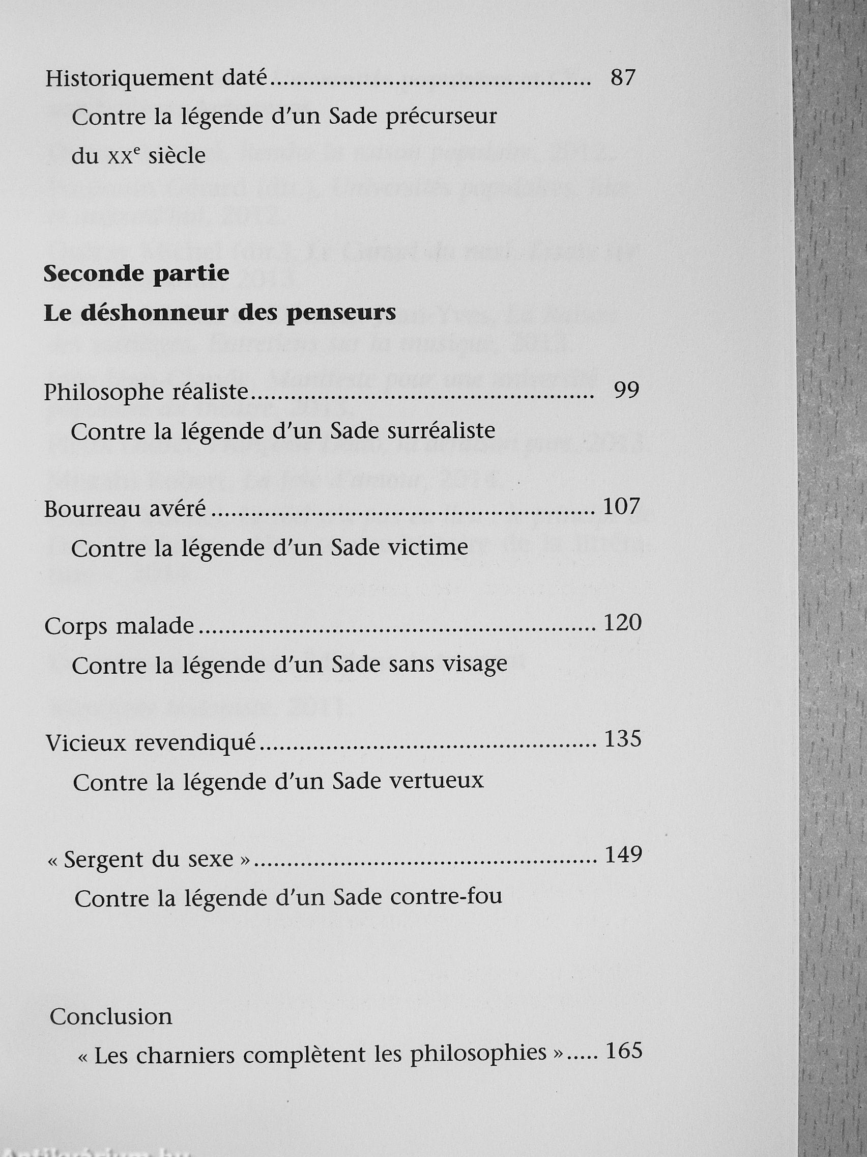 Pourquoi Sade qui fut, au dire meme de ses hagiographes, coupable de séquestrations, de viols en réunion, de menaces de mort, de traitements inhumains et dégradants, de tortures, de tentatives d'empoisonnement, fut-il porté aux nues par l'intelligentsia française pendant tout le XX^ siecle ? De Breton a Bataille, de Barthes a Lacan, de Deleuze a SoUers, tous ont vu en lui un philosophe visionnaire, défenseur des libertés, un féministe victime de tous les régimes ? Fidele a sa méthode, Michel Onfray croise la vie, l'ouvre et la correspondance de Sade. Romancier, il n'y aurait rien a redire a ses fictions ; mais Sade se réclame de la philosophie matérialiste, mais il laisse une place possible a la liberté, puis fait le choix du mal. Des lors, cet homme triomphe moins en libérateur du genre humain qu'en dernier féodal royaliste, misogyne, phallocrate, violent.