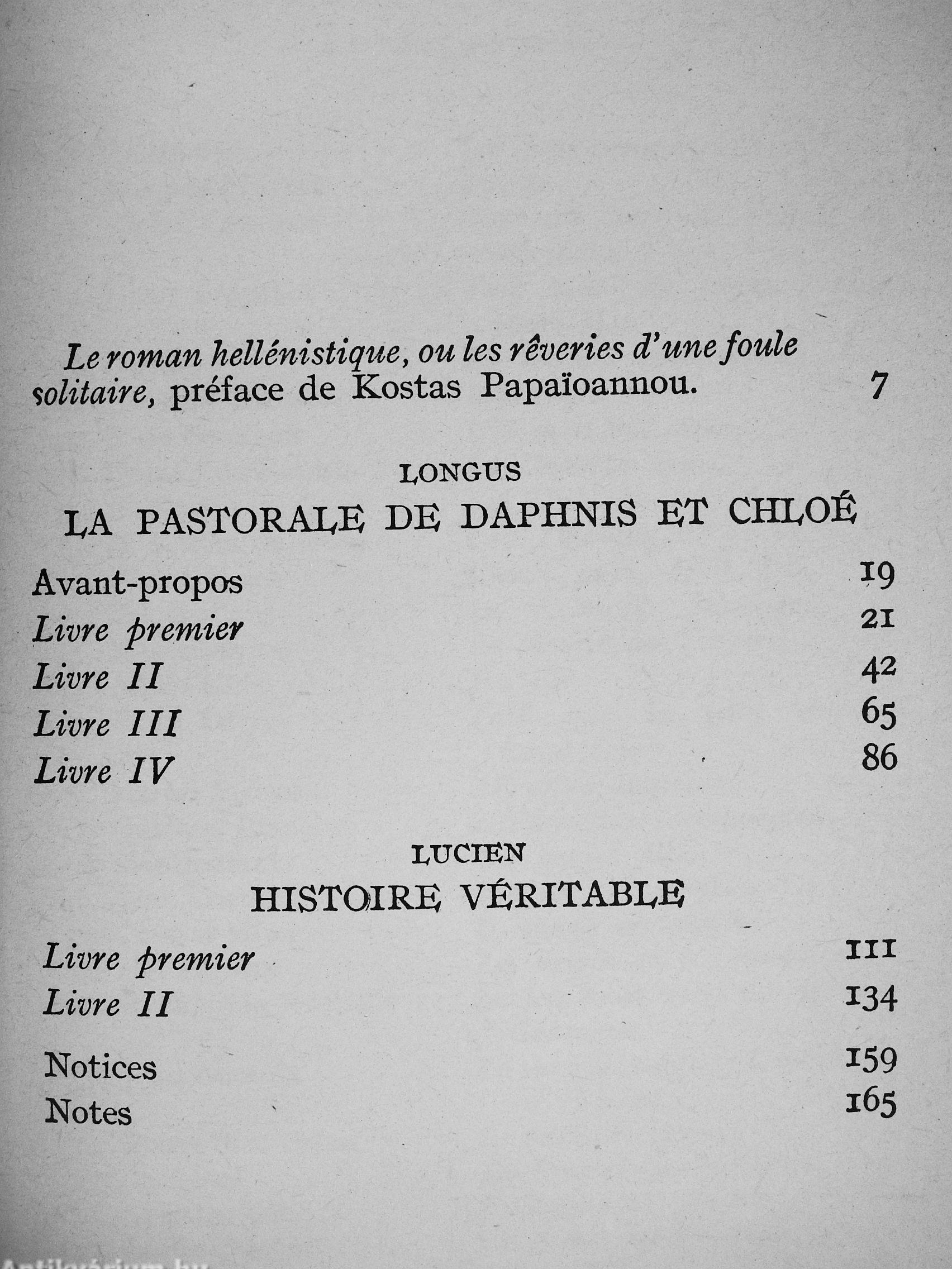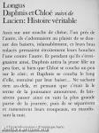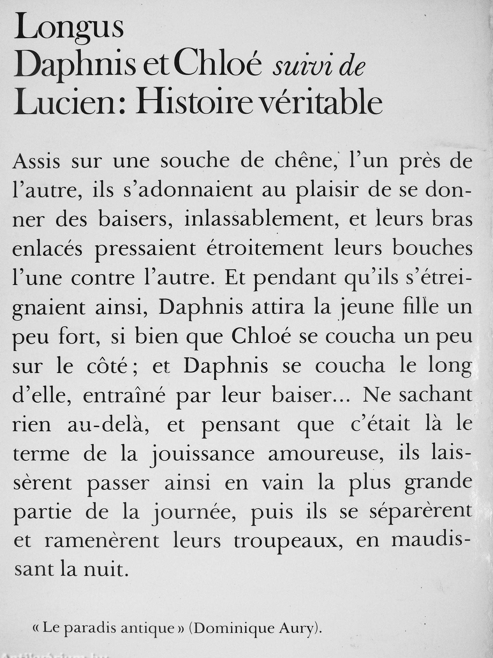 Assis sur une souche de chene, l'un pres de l'autre, ils s'adonnaient au plaisir de se donner des baisers, inlassablement, et leurs bras enlacés pressaient étroitement leurs bouches l'une contre l'autre. Et pendant qu'ils s'étrei-gnaient ainsi, Daphnis attira la jeune fille un peu fort, si bien que Chloé se coucha un peu sur le côté ; et Daphnis se coucha le long d'elle, entraîné par leur baiser Ne sachant rien au-dela, et pensant que c'était la le terme de la jouissance amoureuse, ils laisserent passer ainsi en vain la plus grande partie de la journée, puis ils se séparerent et ramenerent leurs troupeaux, en maudissant la nuit.