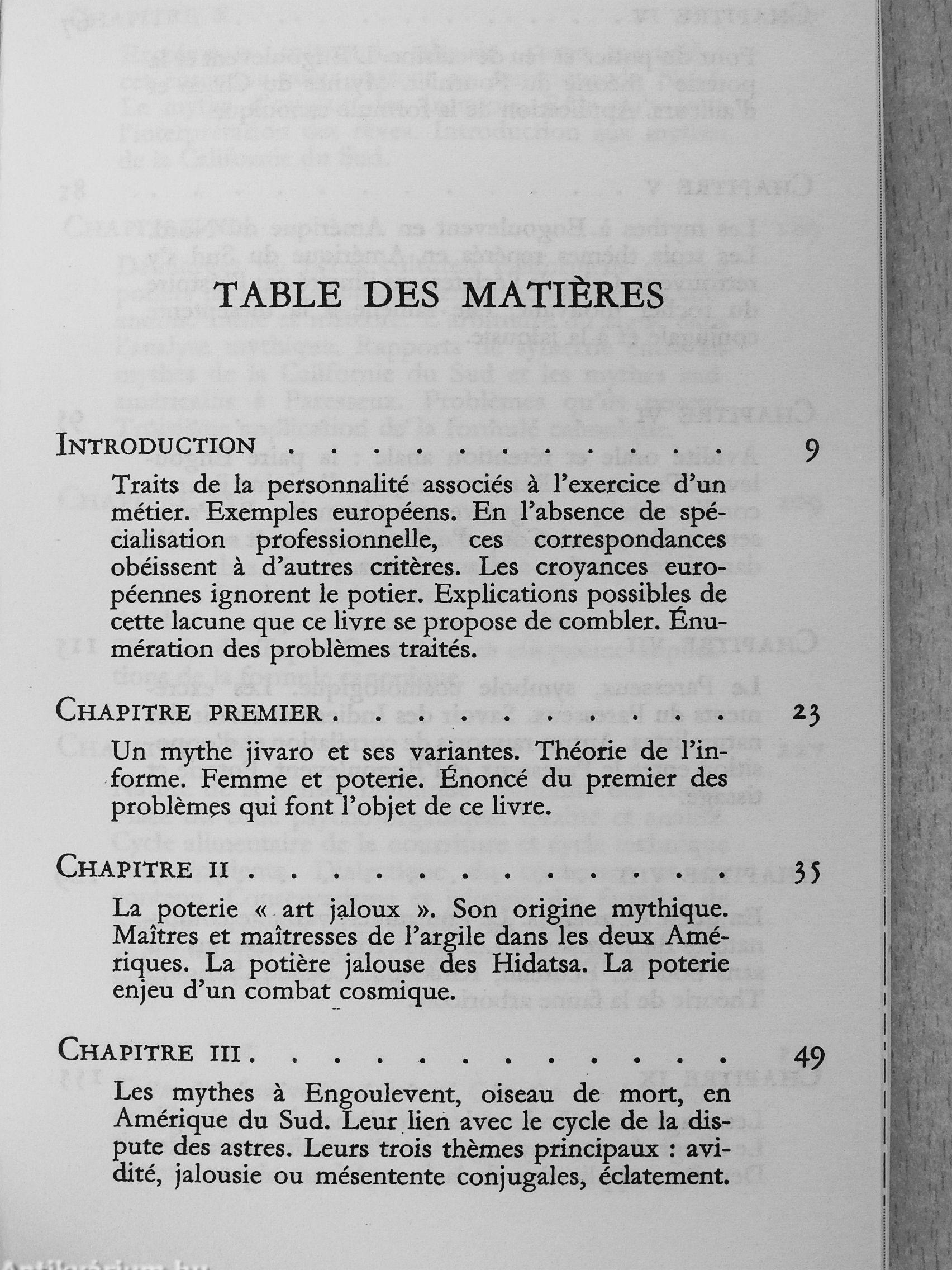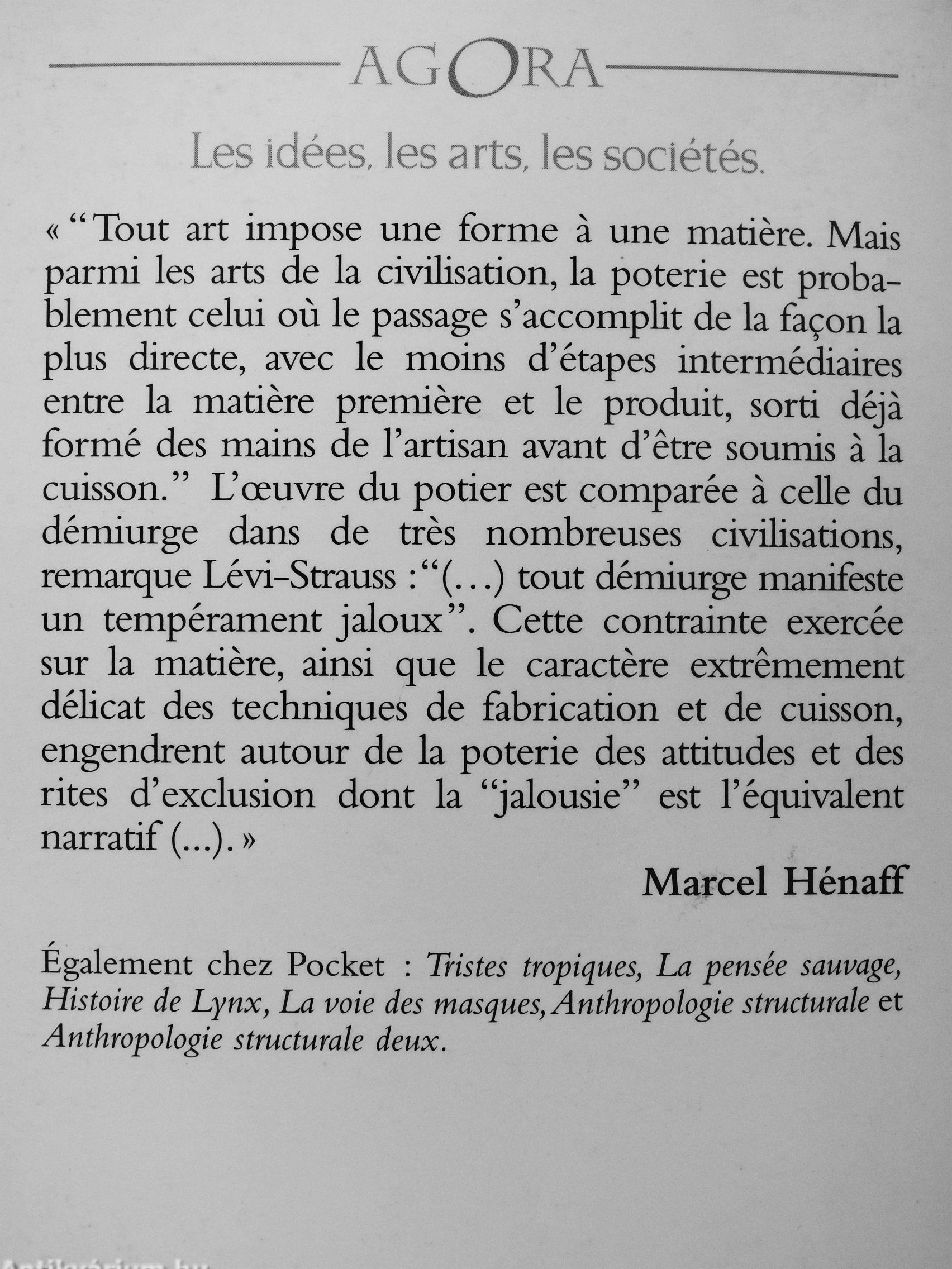 «"Tout art impose une forme a une matiere. Mais parmi les arts de la civilisation, la poterie est probablement celui ou le passage s'accomplit de la façon la plus directe, avec le moins d'étapes intermédiaires entre la matiere premiere et le produit, sorti déja formé des mains de l'artisan avant d'etre soumis a la cuisson." L'ouvre du potier est comparée a celle du démiurge dans de tres nombreuses civilisations, remarque Lévi-Strauss :"(•••) tout démiurge manifeste un tempérament jaloux". Cette contrainte exercée sur la matiere, ainsi que le caractere extremement délicat des techniques de fabrication et de cuisson, engendrent autour de la poterie des attitudes et des rites d'exclusion dont la "jalousie" est l'équivalent narratif ( ). »