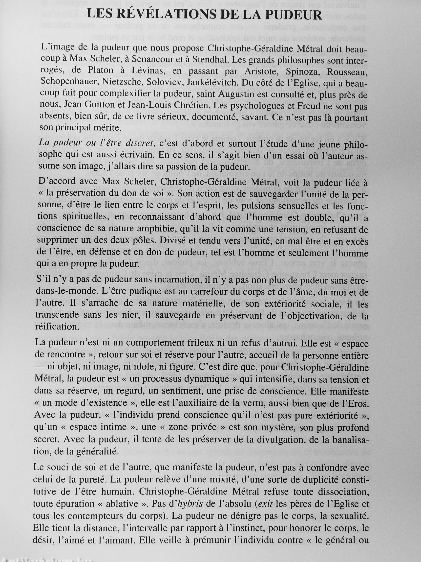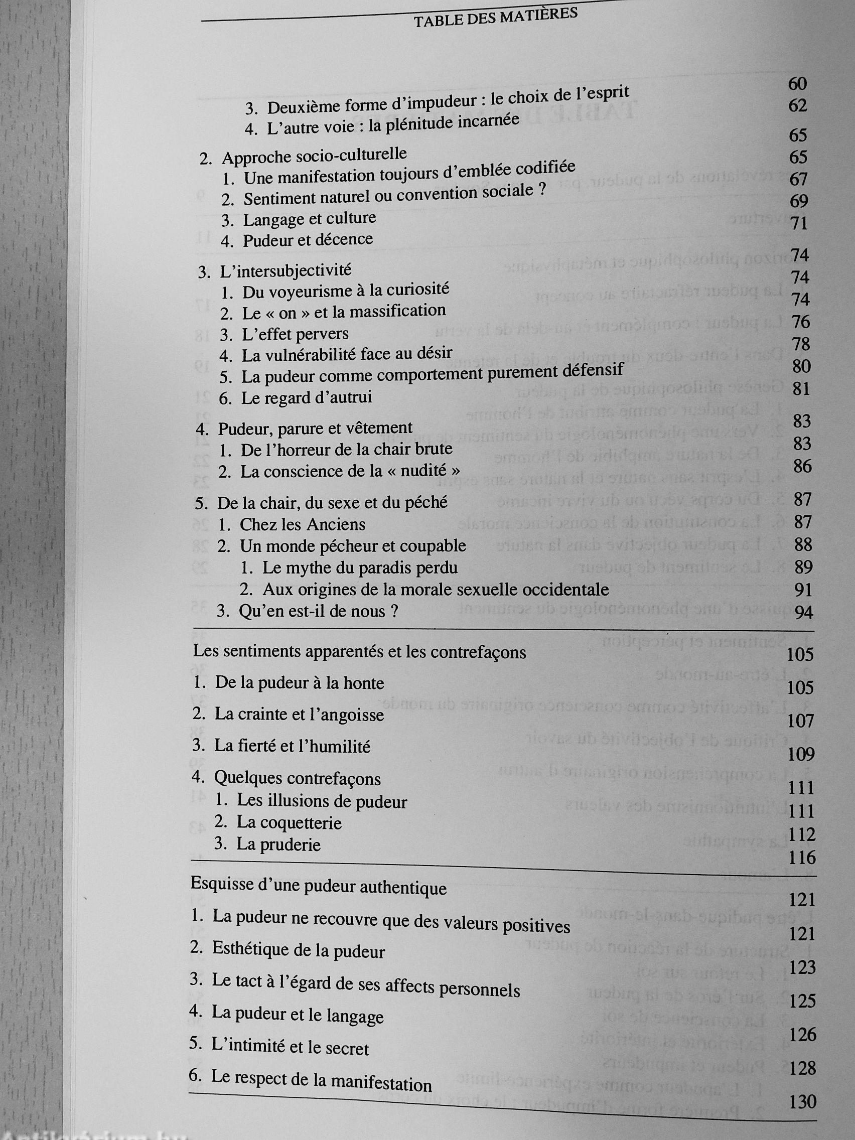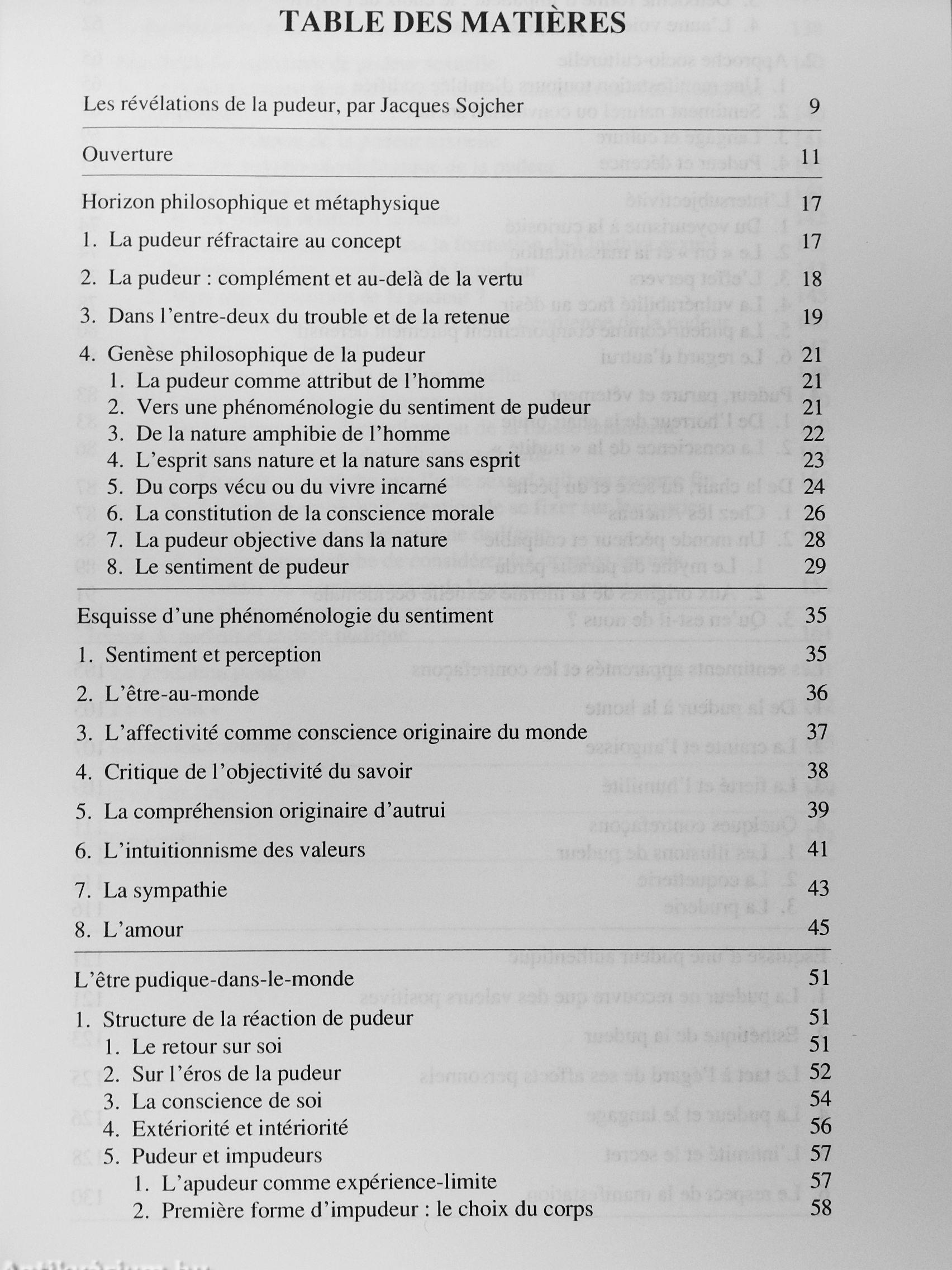 La pudeur ou l'etre discret accueille la parole des philosophes (Platon, Aristote, Nietzsche, Scheler, Soloviev, Jankélévitch), des écrivains (Balzac, Senancour, Stendhal) et des penseurs (Joubert, Blanchot, Bataille). Vissza