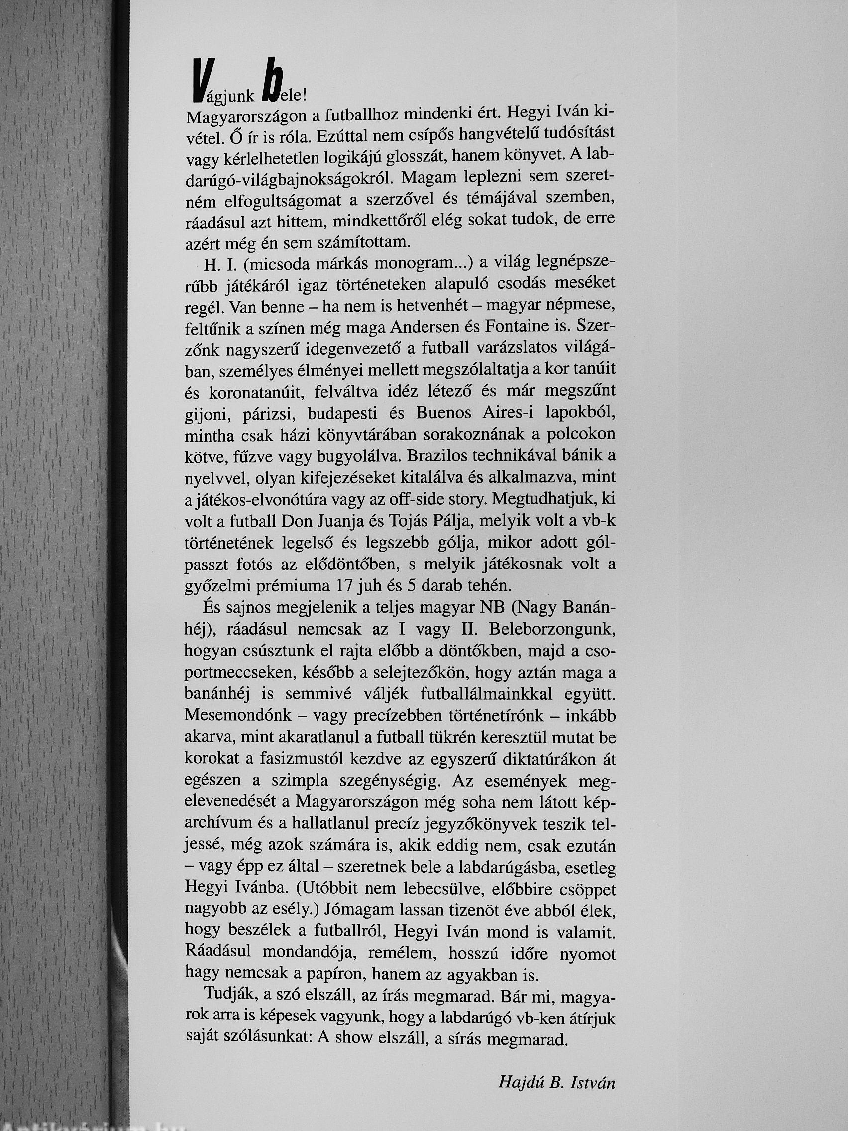 És sajnos megjelenik a teljes magyar NB (Nagy Banánhéj), ráadásul nemcsak az I vagy II. Beleborzongunk, hogyan csúsztunk el rajta elóljb a döntőTcben, majd a csoportmeccseken, későlíb a selejtezóTíön, hogy aztán maga a banánhéj is semmivé váljék futballálmainkkal együtt. Mesemondónk - vagy precízebben történetírónk - inkább akarva, mint akaratlanul a futball tükrén keresztül mutat be korokat a fasizmustól kezdve az egyszerű diktatúrákon át egészen a szimpla szegénységig. Az események meg-elevenedését a Magyarországon még soha nem látott képarchívum és a hallatlanul precíz jegyzőkönyvek teszik teljessé, még azok számára is, akik eddig nem, csak ezután - vagy épp ez által - szeretnek bele a labdarúgásba, esetleg Hegyi Ivánba. (Utóbbit nem lebecsülve, előljbire csöppet nagyobb az esély.) Jómagam lassan tizenöt éve abból élek, hogy beszélek a futballról. Hegyi Iván mond is valamit. Ráadásul mondandója, remélem, hosszú időre nyomot hagy nemcsak a papíron, hanem az agyakban is.