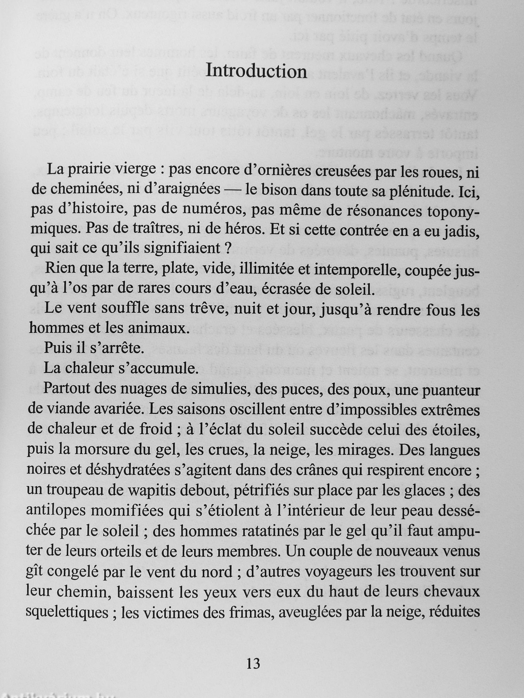 Wisconsin, 1873. La panique financiere accule de nombreux Américains au suicide. Ceux qui ont le courage de survivre partent vers l'Ouest. C'est le cas de Jenny et Otto Dousmann, émigrants allemands : apres la mort de leurs parents, ils se dirigent vers les Grandes Plaines, ou ils s'associent avec Raleigh MacKay et ses deux acolytes. L'un d'eux, Tom Shield, est un sang-melé cheyénne que Jenny va apprendre a connaître et a respecter. Elle retrouvera ; le gout pour la vie au sein de son peuple. , Ce roman, a la fois sauvage et : lyrique, est un réquisitoire lapidaire contre la sottise écologique et le révisionnisme historique, une mise en j garde. La Prairie, véritable personnage du livre, réceptacle d'un monde a l'agonie, fait corps avec le massacre des Indiens et des bisons. Marqué par la yiplence et le sang, ce tableau de l'Ouest ainéricain, avec ses descriptions macabres, mais réalistes, aussi bién des Blancs que des Indiens, n'épargne personnie,