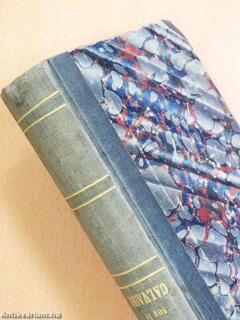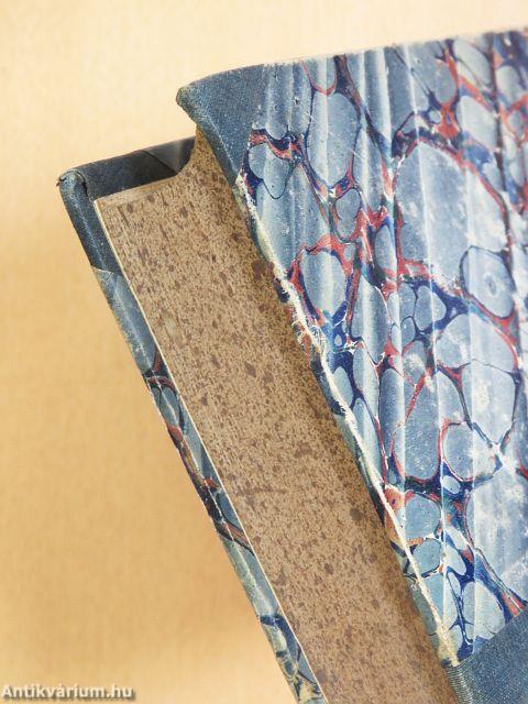 A gerinc foltos, elszíneződött. A borító élei kopottak. A gerincen és a borító belső oldalán ragasztott címke látható. Néhány lap foltos.