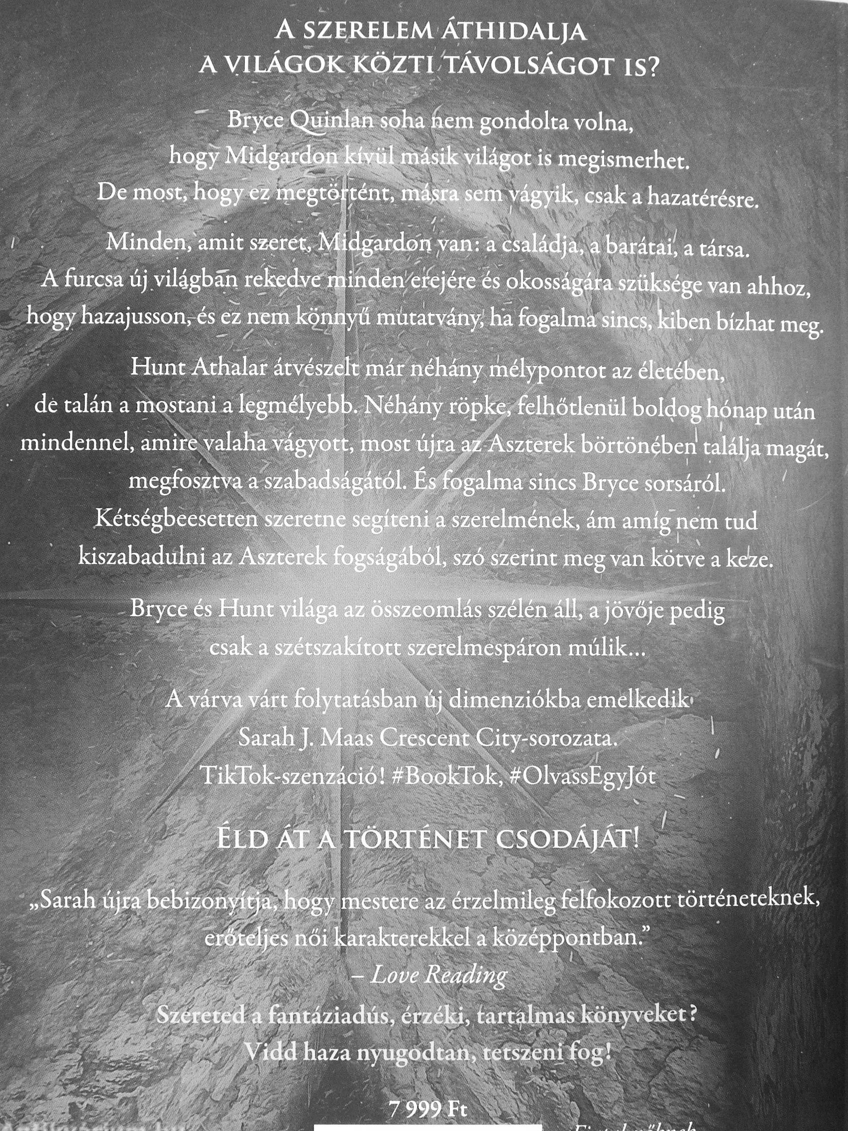 Hunt Athalar átvészelt már néhány mélypontot az életében, de talán a i^stani a legmélyebb. Néhány röpkéi felhőtlenül boldog hónap után mindennel, amire^valaKa vágyott, most újra az Aszterek börtönében találjamagát, megosztva a szabadságától. És fogalma sincs Bryce sorsáról. ' kétségbeesetten szeretne segíteni a szerelmének, ám amíg'nem tud kiszabadulni az Aszterek fogságából, szó szerint meg van kötve a keíze.