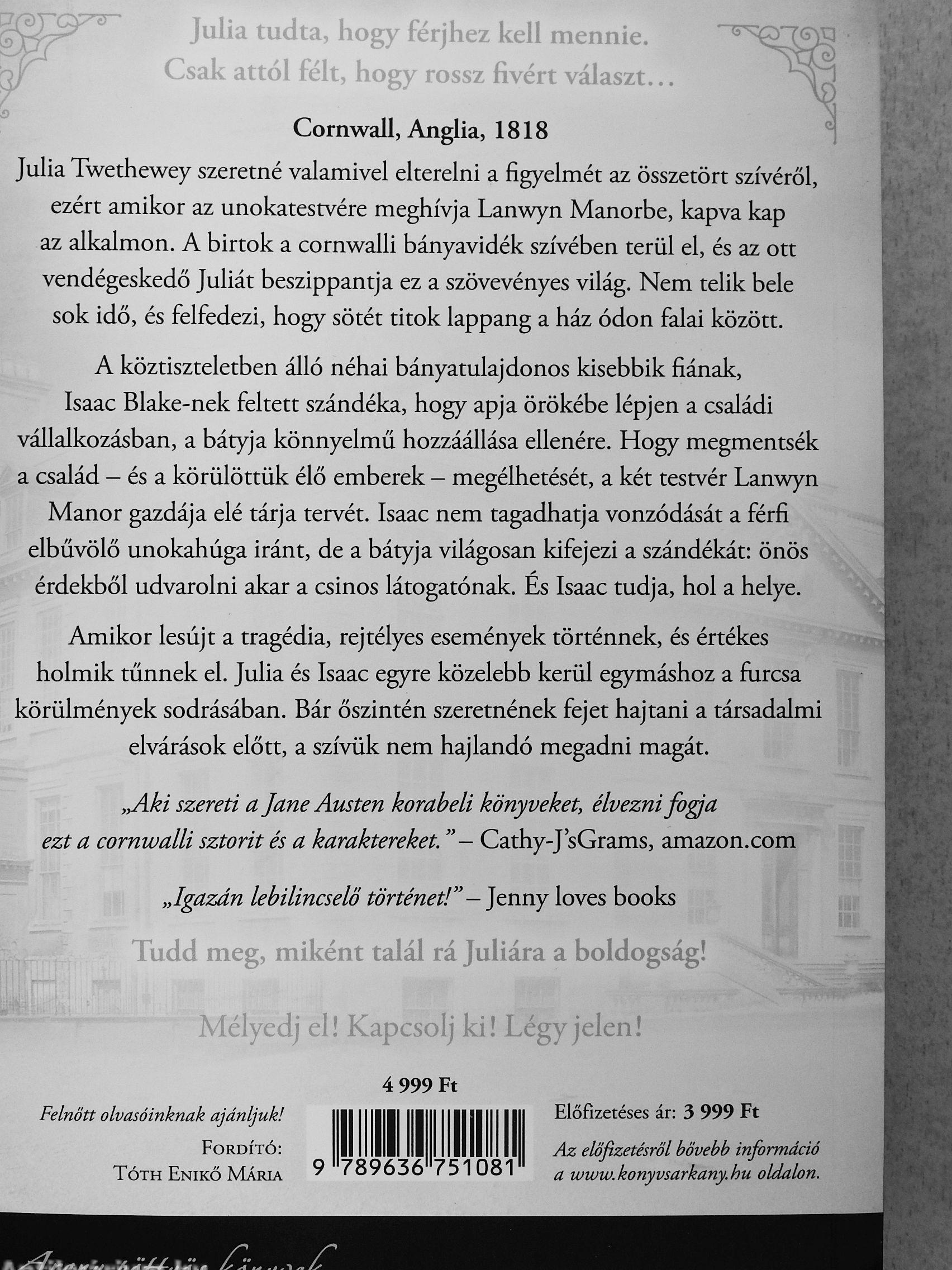 Cornwail, Anglia, 1818 Júlia Twethewey szeretné valamivel elterelni a figyelmét az összetört szívéről, ezért amikor az unokatestvére meghívja Lanwyn Manorbe, kapva kap az alkalmon. A birtok a cornwalli bányavidék szívében terül el, és az ott vendégeskedő Júliát beszippantja ez a szövevényes világ. Nem telik bele sok idő, és felfedezi, hogy sötét titok lappang a ház ódon falai között.