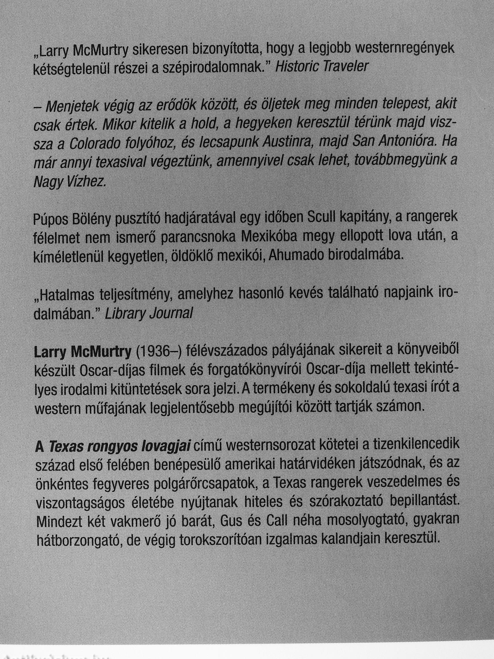Larry McMurtry (1936-) félévszázados pályájának sikereit a könyveiből készült Oscar-díjas filmek és forgatókönyvírói Oscar-díja mellett tekintélyes irodalmi kitüntetések sora jelzi. A termékeny és sokoldalú texasi írót a western műfajának legjelentősebb megújítói között tartják számon.