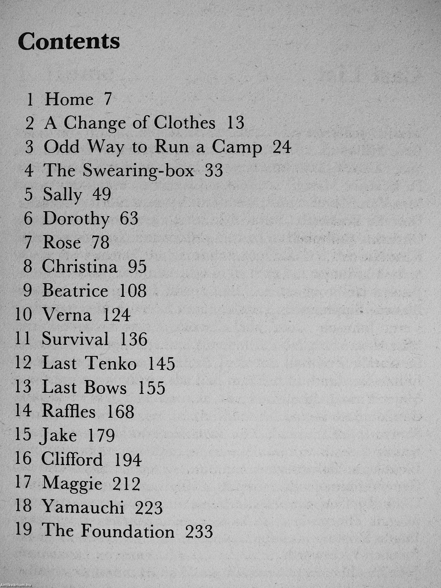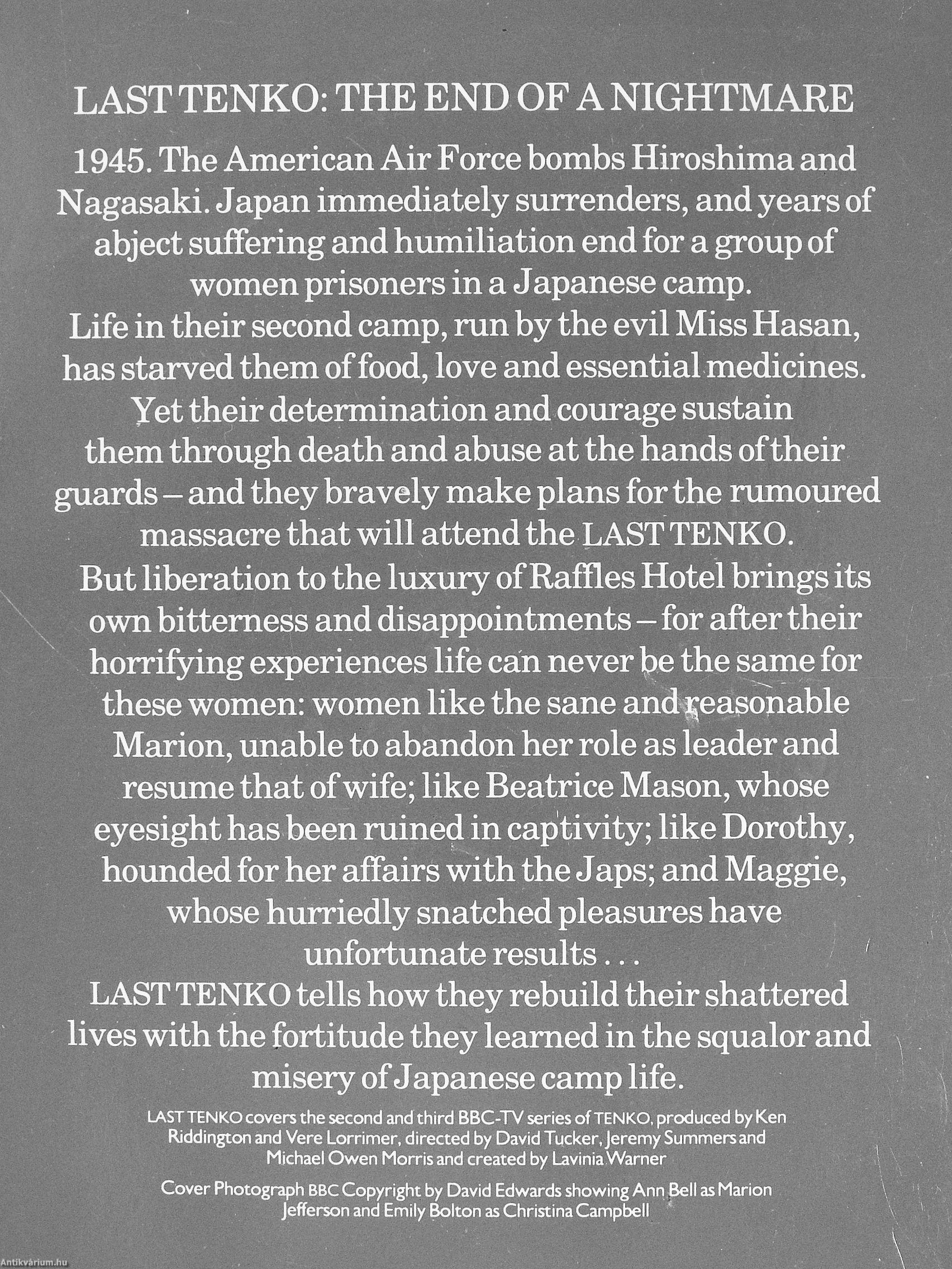 1945. The American Air Force bombs Hiroshima and Nagasaki. Japan immediately surrenders, and years of abject suffering and humiliation end for a group of women prisoners in a Japanese camp. Life in their second camp, mn by the evil Miss Hasan, has starved them of food, love and essential medicines. Yet their determination and courage sustain them through death and abuse at the hands of their guards - and they bravely make plans for the rumoured massacre that will attend the LAST TENKO. But liberation to the luxury of Raffles Hotel brings its own bitterness and disappointments - for after their horrifying experiences life can never foe the same for these women: women like the sane and^easonable Marion, unable to abandon her role as leader and resume that of wife; like Beatrice Mason, whose eyesight has been mined in captivity; like Dorothy, hounded for her affairs with the Japs; and Maggie, whose hurriedly snatched pleasures have unfortunate...