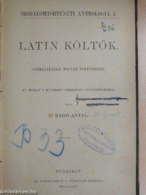 A forditások közé fölvettem néhány olyat is, melyet nem én készitettem: Plautust Csiky Gergely kitűnő átültetésében találja meg a közönség, Propertiust és két Catullus-féle verset dr. Csengeri János elismert jelességű forditásában nyújtom, Horatius három ódáját Szász Károly mintaszerű magyaritásában vettem be, végül Ráth kiadó ur megengedte, hogy Arany ismert Horatius-forditásával is növelhessen e mű értékét. Fogadják amazok is, ő is őszinte köszönetemet. Vissza