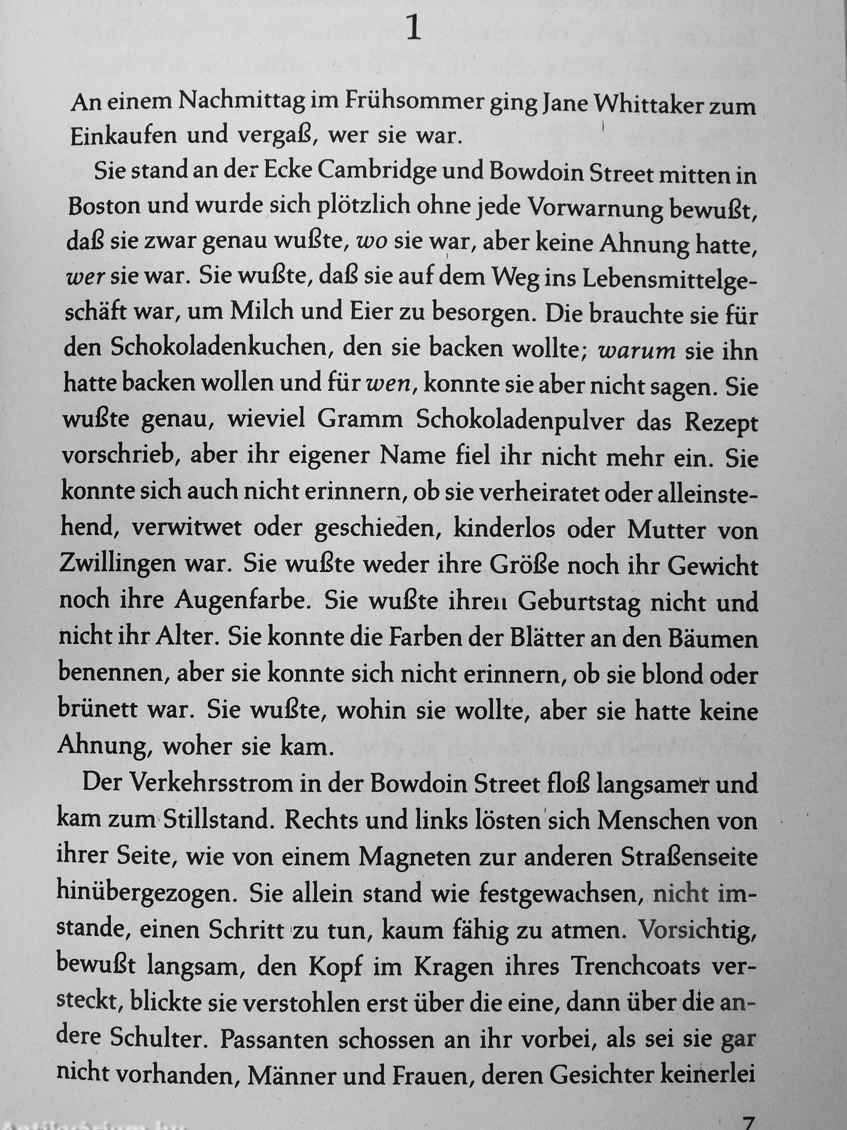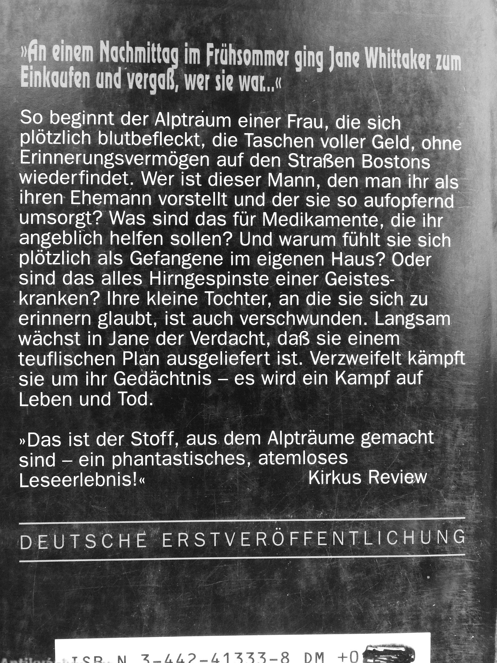 - ä-.^ 5 ¦ • Vi4 ;• So beginnt der Alpträunn einer Frau, die sich plötzlich blutbefleckt, die Taschen voller Geld, ohne Erinnerungsvermögen auf den Straßen Bostons wiederfindet. Wer ist dieser Mann, den man ihr als ^ ihren Ehemann vorstellt und der sie so aufopfernd umsorgt? Was sind das für Medikamente, die ihr . angeblich helfen sollen? Und warum fühlt sie sich / plötzlich als Gefangene im eigenen Haus? Oder : sind das alles Hirngespinste einer Geistes-V > kranken? Ihre kleine Tochter, an die sie sich zu erinnern glaubt, ist auch verschwunden. Langsam wächst in Jane der Verdacht, daß sie einem teuflischen Plan ausgeliefert ist. Verzweifelt kämpft sie um ihr Gedächtnis - es wird ein Kampf auf Leben und Tod. , I