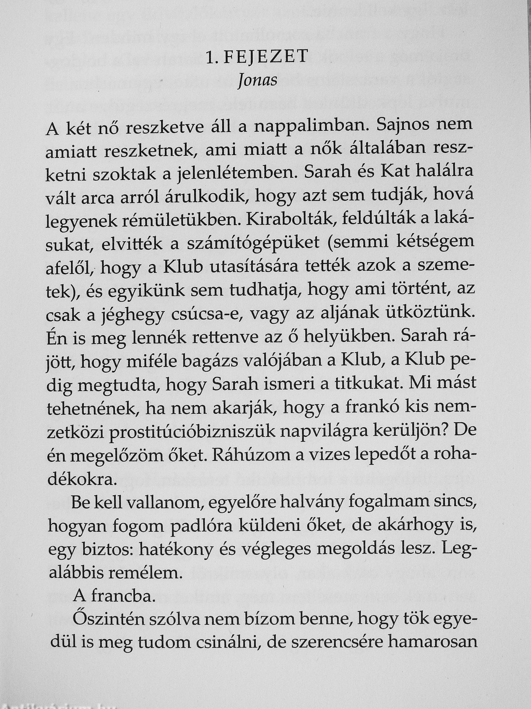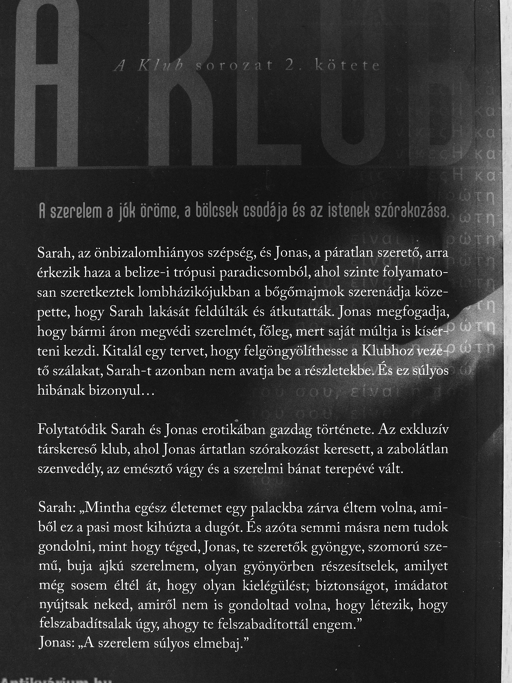 Sarah, az önbizalomhiányos szépség, és Jonas, a páratlan szerető, arra érkezik haza a belize-i trópusi paradicsomból, ahol szinte folyamatosan szeretkeztek lombházikójukban a bőgőmajmok szerenádja közepette, hogy Sarah lakását feldúlták és átkutatták. Jonas megfogadja, hogy bármi áron megvédi szerelmét, főleg, mert saját múltja is kíséf+' teni kezdi. Kitalál egy tervet, hogy felgöngyölíthesse a Klubhoz; vezé-P tő szálakat, Sarah-t azonban nem avatja be a részletekbe. Es ez súlyos hibának bizonyul