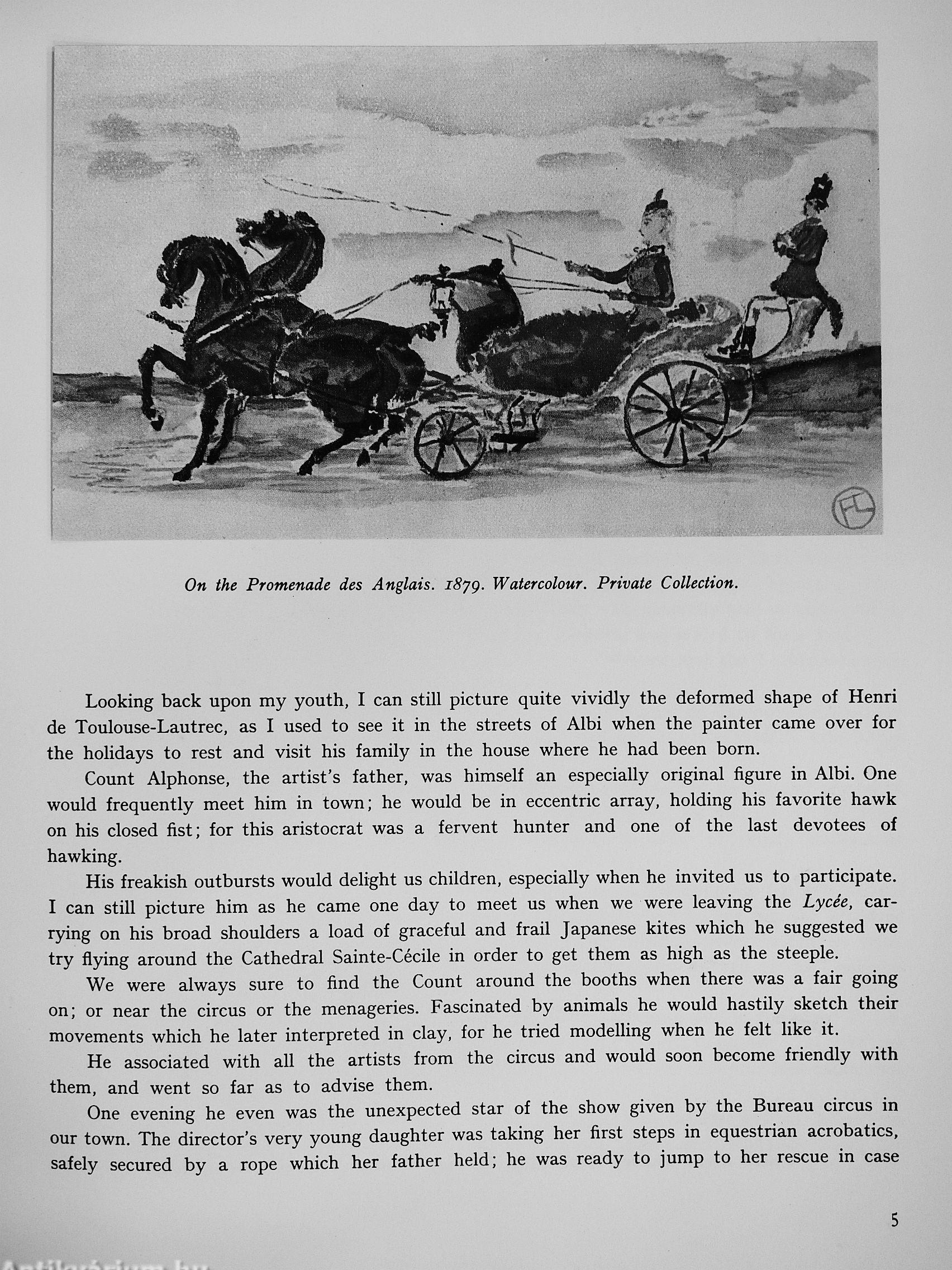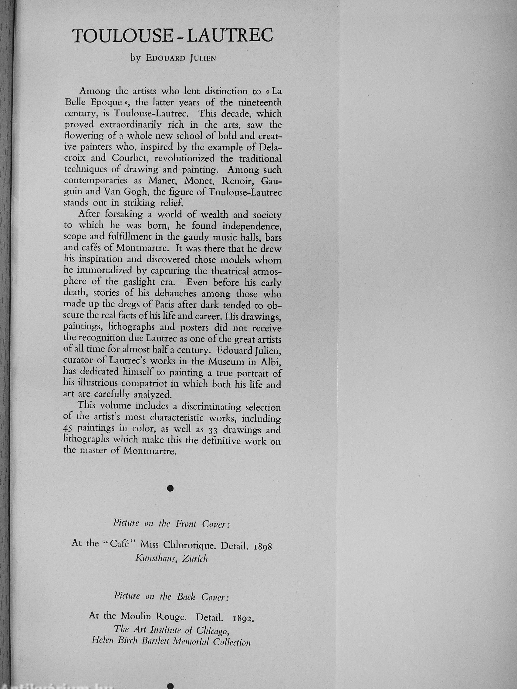 After forsaking a world of wealth and society to which he was born, lie found independence, scope and fulfillment in the gaudy music halls, bars and cafés of Montmartre. It was there that he drew liis inspiration and discovered those models whom he immortalized by capturing the theatrical atmosphere of the gaslight era. Even before his early death, stories of his debauches among those who made up the dregs of Paris after dark tended to obscure the real facts ofhis life and career. His drawings, paintings, lithographs and posters did not receive the recognition due Lautrec as one of the great artists of all time for almost half a century. Edouard Julien, curator of Lautrec's works in the Museum in Albi, has dedicated himself to painting a true portrait of liis illustrious compatriot in which both his life and art are carefully analyzed.