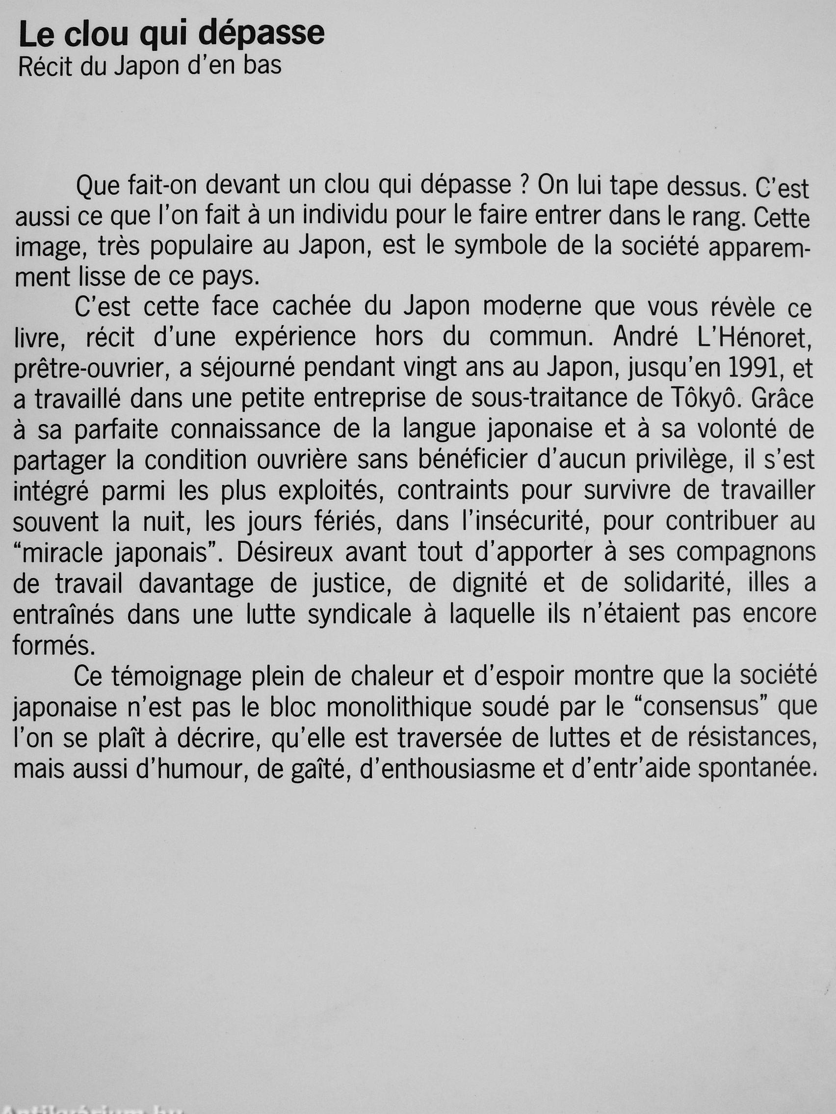 C'est cette face cachée du Japon moderne que vous révele ce livre, récit d'une expérience hors du commun. André L'Hénoret, pretre-ouvrier, a séjourné pendant vingt ans au Japon, jusqu'en 1991, et a travaillé dans une petite entreprise de sous-traitance de Tôkyô. Grâce a sa parfaite connaissance de la langue japonaise et a sa volonté de partager la condition ouvriere sans bénéficier d'aucun privilege, il s'est intégré parmi les plus exploités, contraints pour survivre de travailler souvent la nuit, les jours fériés, dans l'insécurité, pour contribuer au "miracle japonais". Désireux avant tout d'apporter a ses compagnons de travail davantage de justice, de dignité et de solidarité, illes a entraînés dans une lutte syndicale a laquelle ils n'étaient pas encore formés.