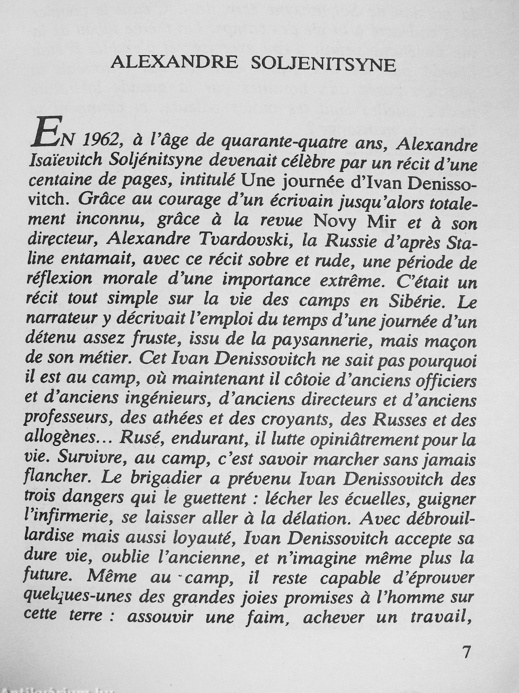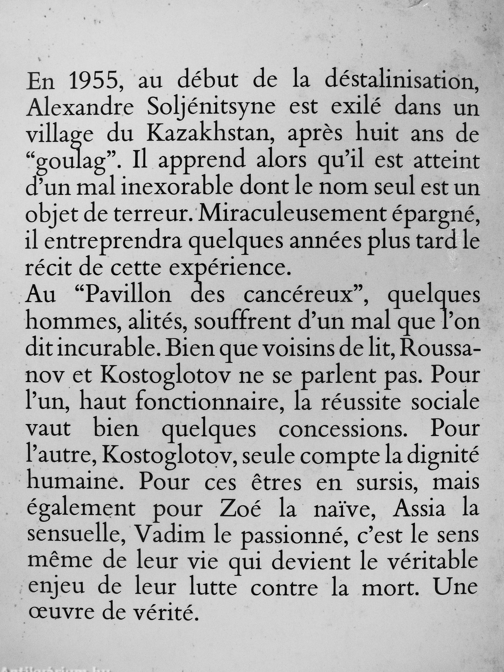 En 1955, au début de la déstalinisation, Alexandre Soljénitsyne est exilé dans un village du Kazakhstan, apres huit ans de "goulag". Il apprend alors qu'il est atteint d'un mal inexorable dont le nom seul est un objet de terreur. Miraculeusement épargné, il entreprendra quelques années plus tard le récit de cette expérience. Au "Pavillon des cancéreux", quelques lommes, alités, souffrent d'un mal que l'on dit incurable. Bien que voisins de lit, Roussa-nov et Kostoglotov ne se parlent pas. Pour 'un, haut fonctionnaire, la réussite sociale vaut bien quelques concessions. Pour 'autre, Kostoglotov, seule compte la dignité humaine. Pour ces etres en sursis, mais également pour Zoé la naive, Assia la sensuelle, Vadim le passionné, c'est le sens meme de leur vie qui devient le véritable enjeu de leur lutte contre la mort. Une ouvre de vérité.
