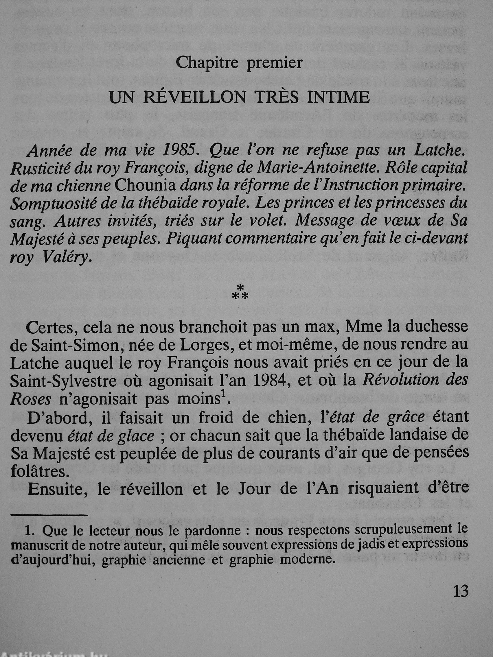 Jean-Michel Royer a pris la balle au bond : c'est au duc de Saint-Simon qu'il a demandé de tenir la chronique des événements qui, ces derniers mois, ont marqué le regne du « Roy François ». Qui mieux que cette plume acérée pouvait « croquer » les princes qui nous gouvernent et ceux qui esperent le faire de nouveau ? Car ici nul sectarisme : Le Pen n'est pas mieux traité que Marchais et l'on ne met pas moins d'insolence a évoquer la guerre des « Trois cavaUers » de l'opposition que l'ascension du jeune « Fafa ». Le monde poUtique tout entier y passe, étrillé, mais aussi parfois caressé, a contre-poil ! Un Uvre de grande actuaUté, la plus brulante — et aussi la plus mouillée : il y est beaucoup question d'une certaine Piscine