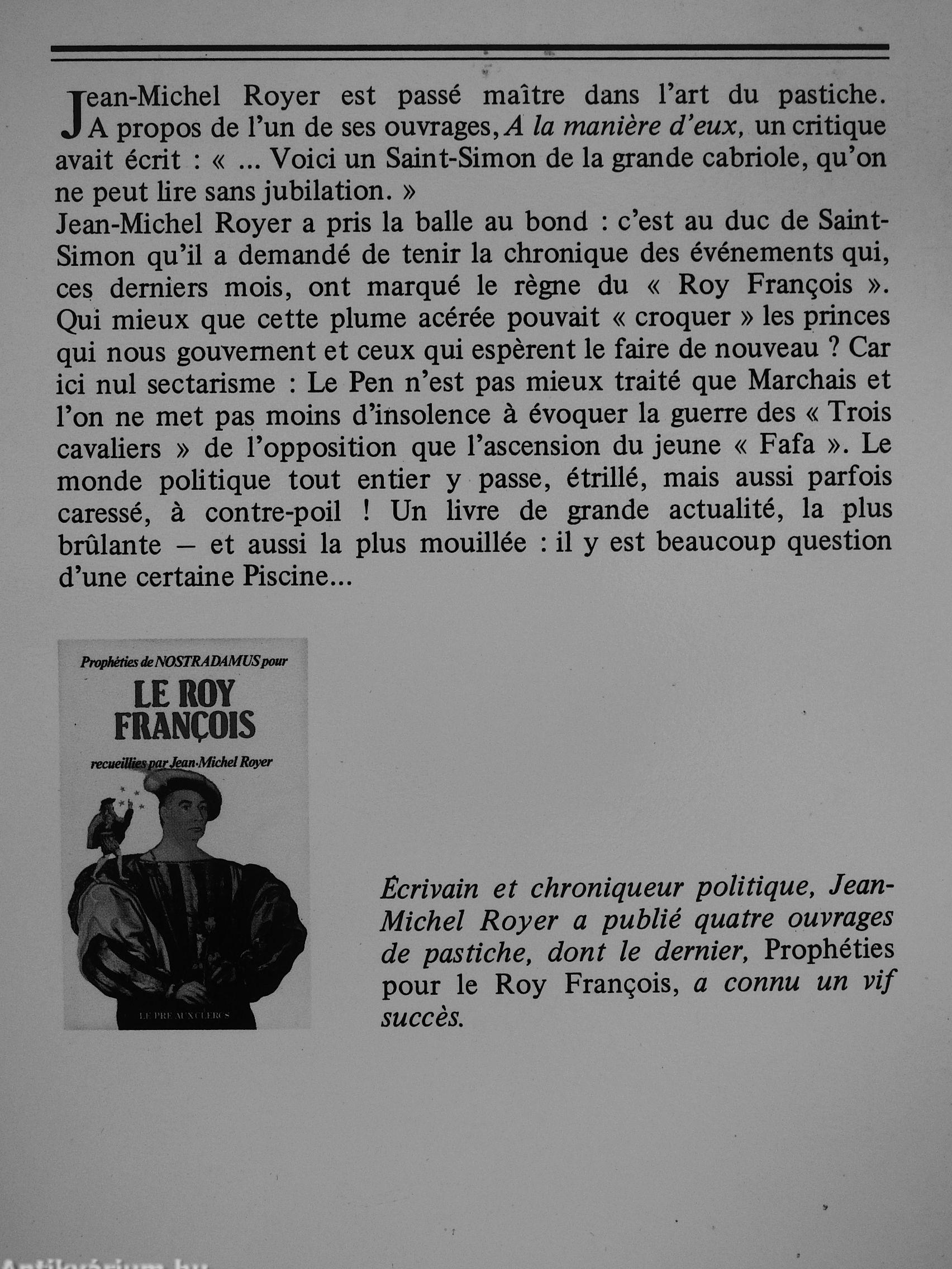 Ecrivain et chroniqueur politique, Jean-Michel Royer a publié quatre ouvrages de pastiche, dont le dernier. Prophéties pour le Roy François, a connu un vif succes.
