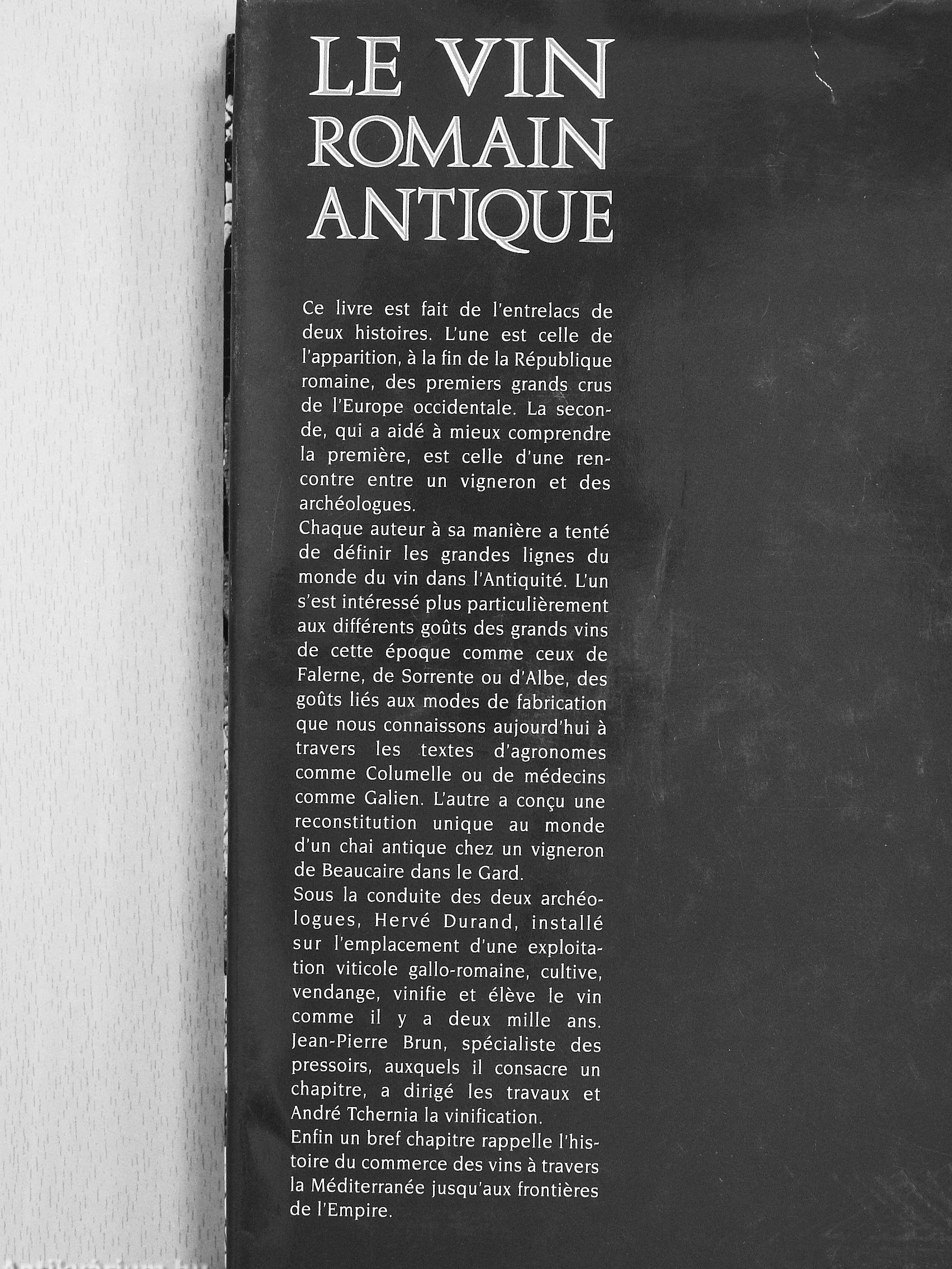 Chaque auteur a sa maniere a tenté de définir les grandes lignes du monde du vin dans l'Antiquité. L'un s'est intéressé plus particulierement aux différents gouts des grands vins de cette époque comme ceux de Falerne, de Sorrente ou d'Albe, des gouts liés aux modes de fabrication que nous connaissons aujourd'hui a travers les textes d'agronomes comme Columelle ou de médecins comme Galien. L'autre a conçu une reconstitution unique au monde d'un chai antique chez un vigneron de Beaucaire dans le Gard. Sous la conduite des deux archéologues, Hervé Durand, installé sur l'emplacement d'une exploitation viticole gallo-romaine, cultive, vendange, vinifie et éleve le vin comme il y a deux mille ans. lean-Pierre Brun, spécialiste des pressoirs, auxquels il consacre un chapitre, a dirigé les travaux et André Tchernia la vinification. Enfin un bref chapitre rappelle l'histoire du commerce des vins a travers la Méditerranée jusqu'aux frontieres de l'Empire.
