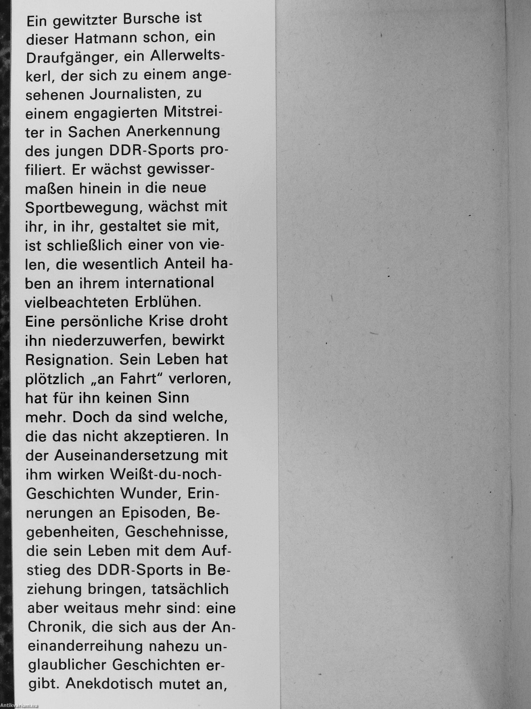 Ein gewitzter Bursche ist dieser Hatmann schon, ein Draufgänger, ein Allerweltskerl, der sich zu einem angesehenen Journalisten, zu einem engagierten Mitstreiter in Sachen Anerkennung des jungen DDR-Sports profiliert. Er wächst gewissermaßen hinein in die neue Sportbewegung, wächst mit ihr, in ihr, gestaltet sie mit, ist schließlich einer von vielen, die wesentlich Anteil haben an ihrem international vielbeachteten Erblühen. Eine persönliche Krise droht ihn niederzuwerfen, bewirkt Resignation. Sein Leben hat plötzlich „an Fahrt" verloren, hat für ihn keinen Sinn mehr. Doch da sind welche, die das nicht akzeptieren. In der Auseinandersetzung mit ihm wirken Weißt-du-noch-Geschichten Wunder, Erinnerungen an Episoden, Begebenheiten, Geschehnisse, die sein Leben mit dem Aufstieg des DDR-Sports in Beziehung bringen, tatsächlich aber weitaus mehr sind: eine Chronik, die sich aus der Aneinanderreihung nahezu unglaublicher Geschichten ergibt. Anekdotisch mutet an,