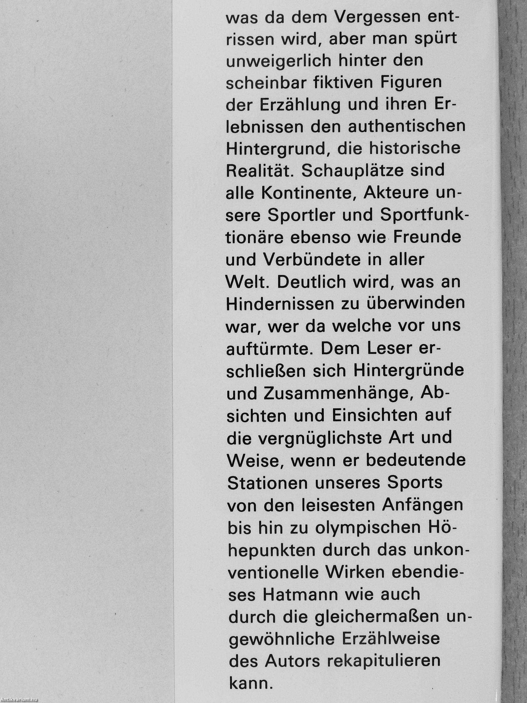 was da dem Vergessen entrissen wird, aber nnan spürt unweigerlich hinter den scheinbar fiktiven Figuren der Erzählung und ihren Erlebnissen den authentischen Hintergrund, die historische Realität. Schauplätze sind alle Kontinente, Akteure unsere Sportler und Sportfunktionäre ebenso wie Freunde und Verbündete in aller Welt. Deutlich wird, was an Hindernissen zu überwinden war, wer da welche vor uns auftürmte. Dem Leser erschließen sich Hintergründe und Zusammenhänge, Absichten und Einsichten auf die vergnüglichste Art und Weise, wenn er bedeutende Stationen unseres Sports von den leisesten Anfängen bis hin zu olympischen Höhepunkten durch das unkonventionelle Wirken ebendie-ses Hatmann wie auch durch die gleichermaßen un- ^ gewöhnliche Erzählweise '
