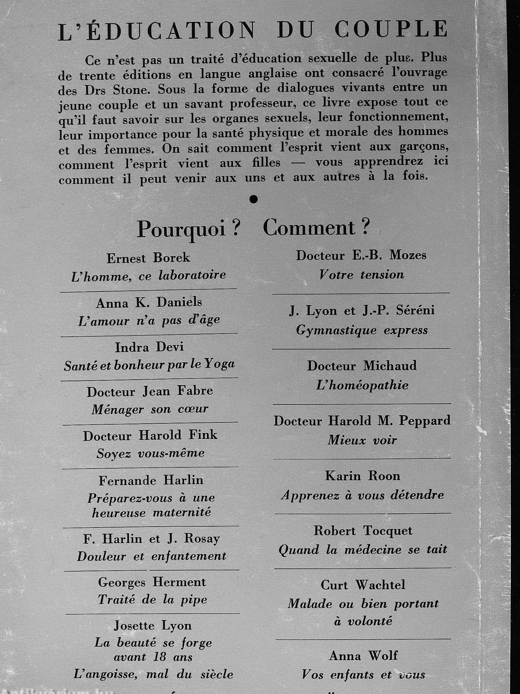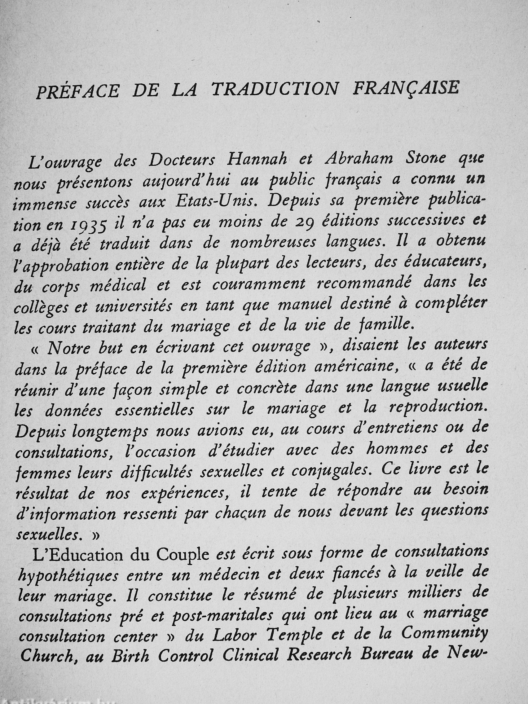 Ce n'est pas un traité d'éducation sexuelle de plus. Plus de trente éditions en langue anglaise ont consacré l'ouvrage des Drs Stone. Sous la forme de dialogues vivants entre un jeune couple et un savant professeur, ce livre expose tout ce qu'il faut savoir sur les organes sexuels, leur fonctionnement, leur importance pour la santé physique et morale des hommes et des femmes. On sait comment l'esprit vient aux garçons, comment l'esprit vient aux filles — vous apprendrez ici comment il peut venir aux uns et aux autres a la fois.