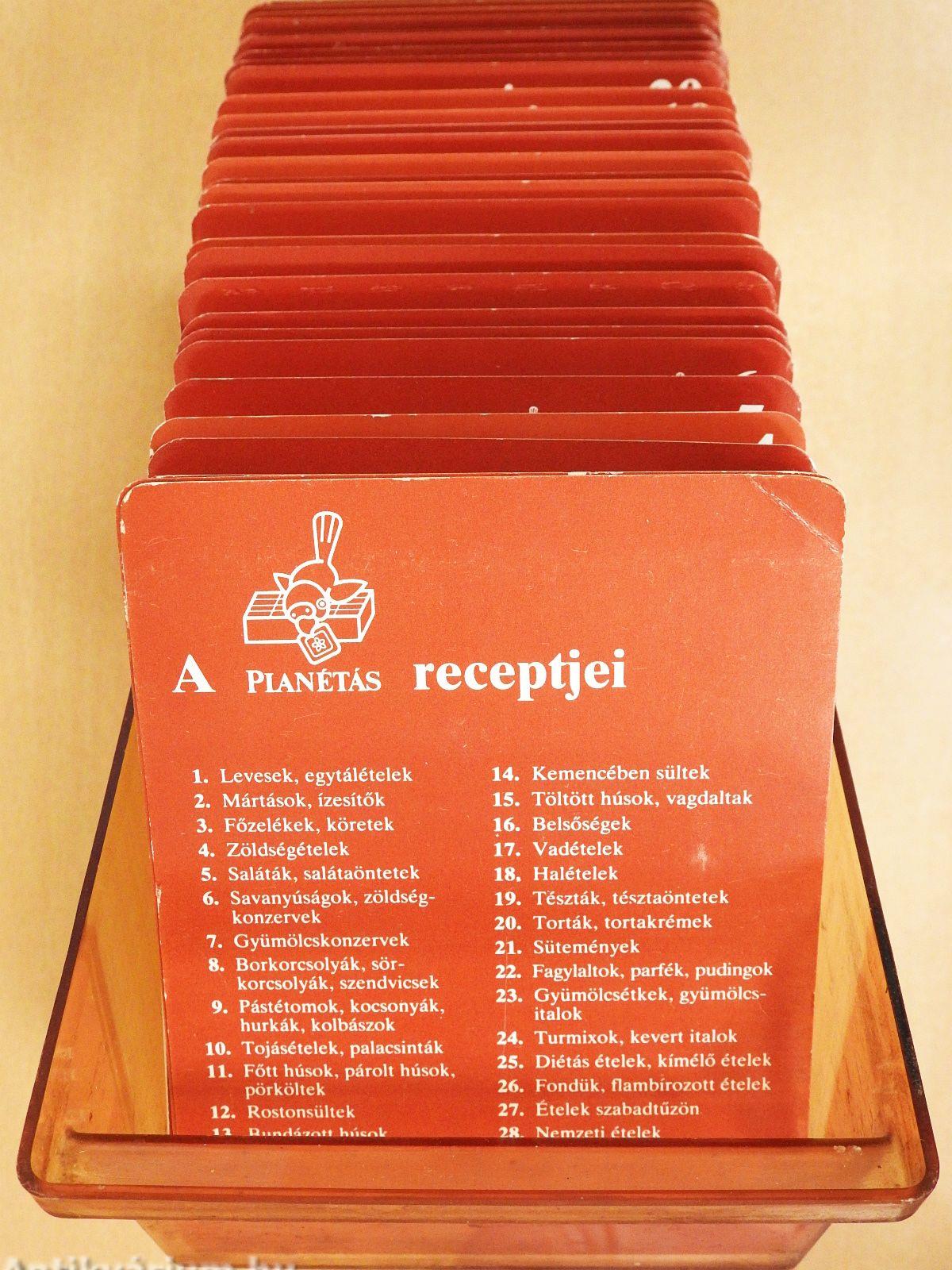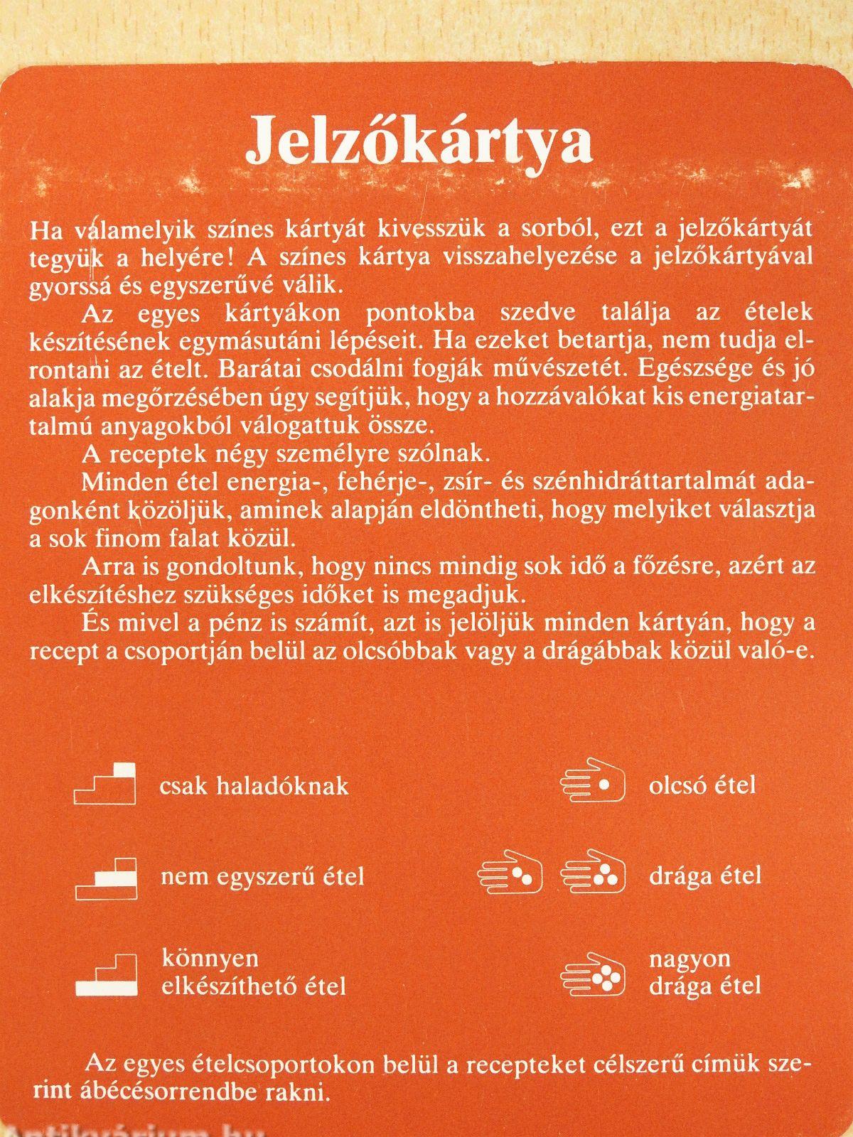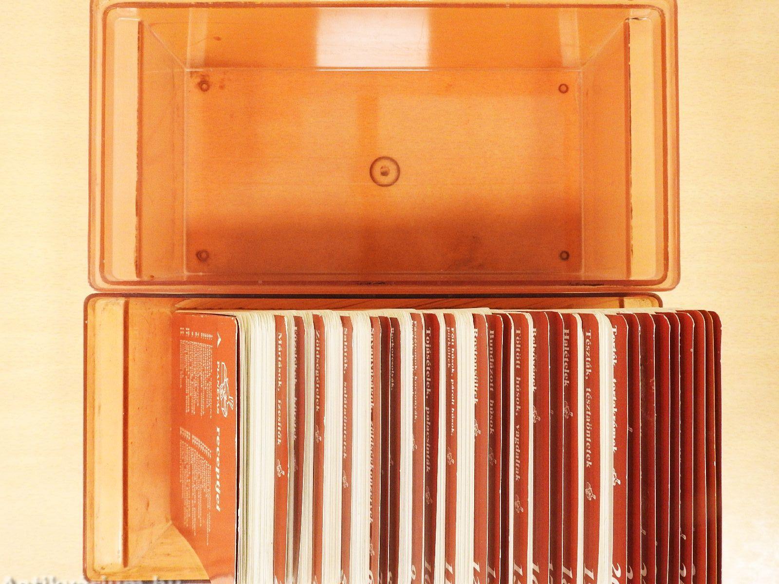 | Megjegyzés: | 1048 db kétoldalas, színes fotókkal illusztrált receptkártya 28 témakörben. Műanyag gyűjtődobozban. |