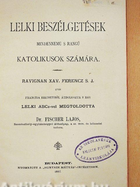 | Megjegyzés: | Ravignan Xav. Ferencz S. J. után franczia eredetiből átdolgozta s egy lelki ABCz-vel megtoldotta Dr. Fischer Lajos, Szombathely-egyházmegyei áldozópap, a sz. mm. és bölcselet tudora. Nyomatott a "Hunyadi Mátyás"-Intézetben, Budapest. |