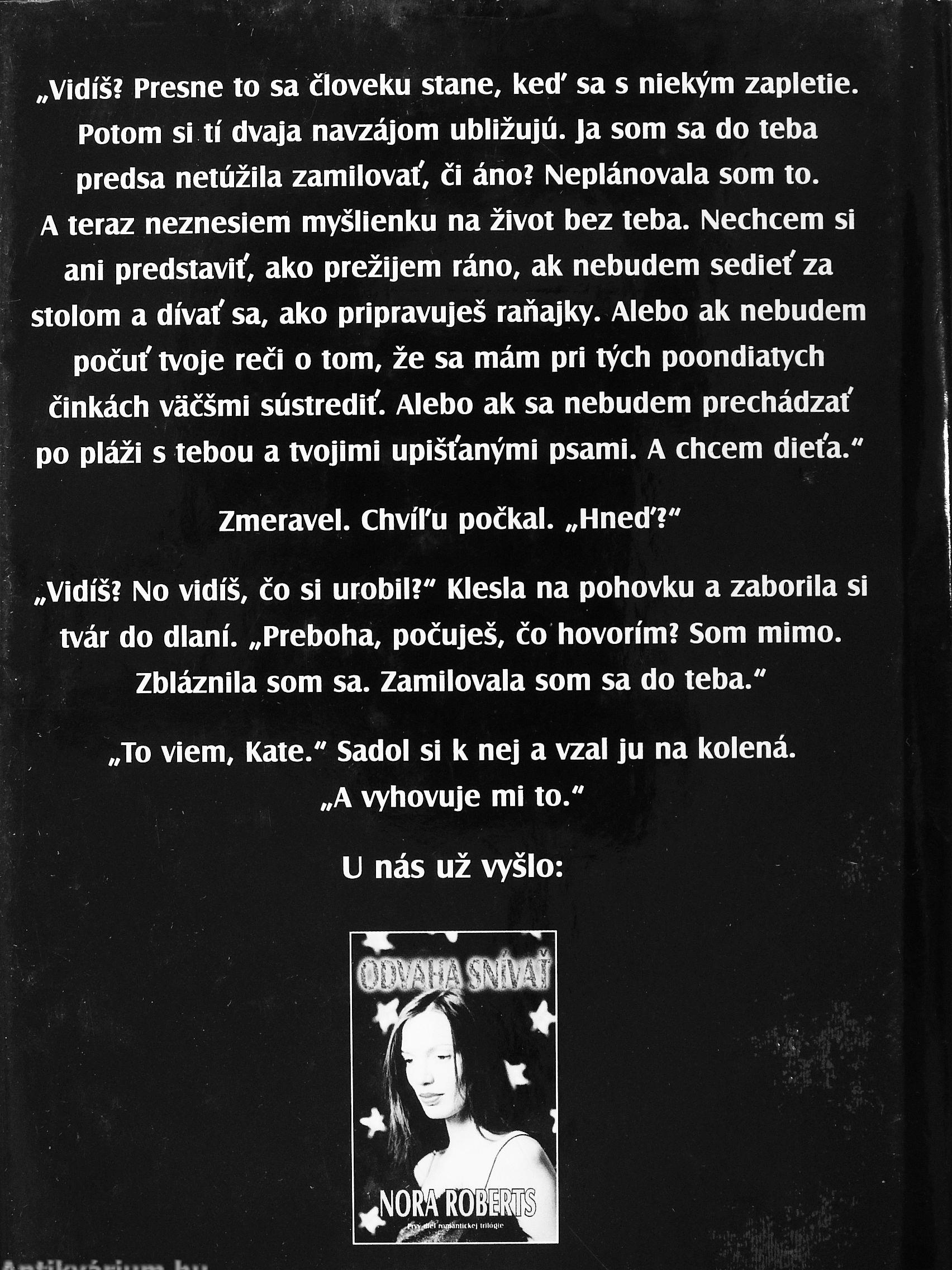 „Vidís? Presne to sa cioveku stane, ked' sa s niekym zapletie. Potom sí tí dvaja navzájom ublízujú. Ja som sa do teba predsa netúzíla zamílovat', ci áno? Neplánovala som to. A feraz neznesiem myslienku na zivot bez teba. Neclicem si