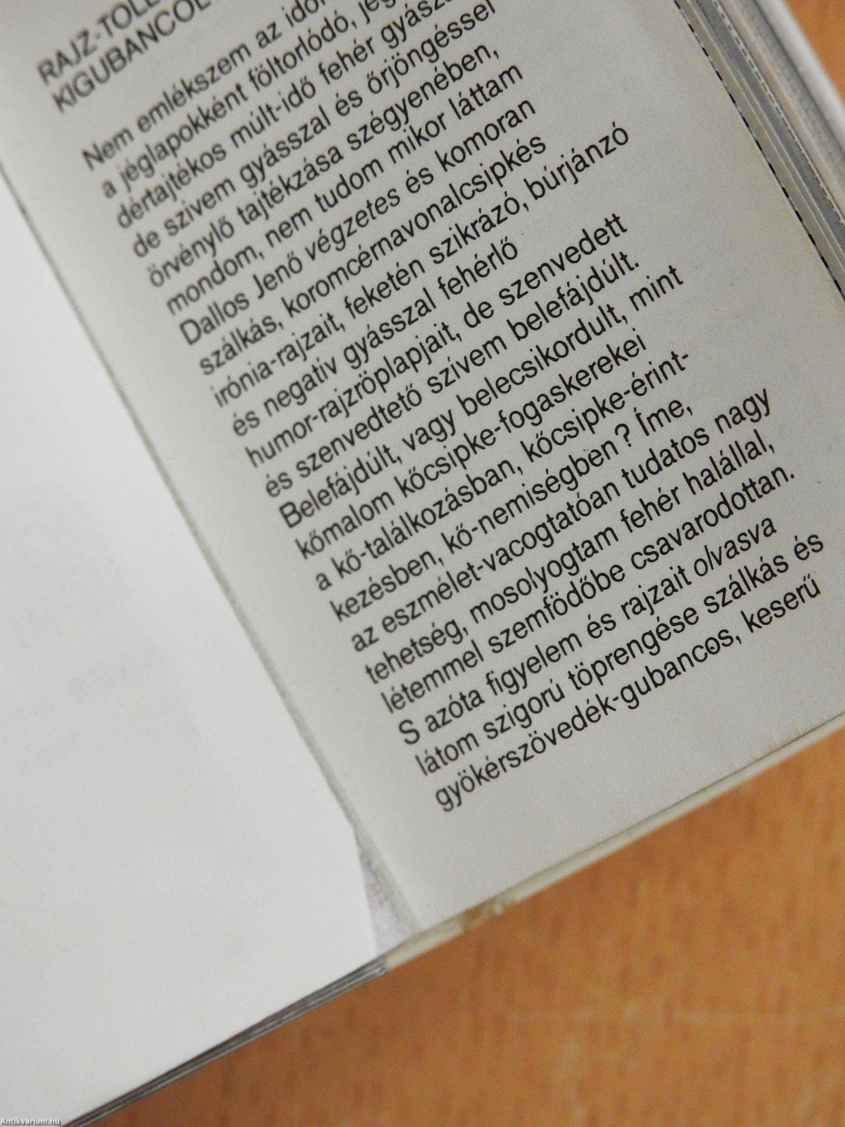 Nem emlékszem az időre, nem, nem a jéglapokként föltorlódó, jéghabos dértajtékos múlt-idő fehér gyászától, de szívem gyásszal és őrjöngéssel örvénylő tajtékzása szégyenében, mondom, nem tudom mikor láttam Dallos Jenő végzetes és komoran szálkás, koromcérnavolancsipkés irónia-rajzait, feketén szikrázó, búrjánzó és negatív gyásszal fehérlő humor-rajzröplapjait, de szenvedett és szenvedtető szívem belefájdúlt. Belefájdúlt, vagy belecsikordult, mint kőmalom kőcsipke-fogaskerekei a kő-találkozásban, kőcsipke-érintkezésben, kő-nemiségben? Íme, az eszmélet-vacogtatóan tudatos nagy tehetség, mosolyogtam fehér halállal, létemmel szemfödőbe csavarodtam. S azóta figyelem és rajzait olvasva látom szigorú töprengése szálkás és gyökérszövedék-gubancos, keserű és megtisztító humor-látomásait, ahogy szálkásan és szivacsosan tépi le magáról és a kődobozok füstölgő, szív-elevenséget nem-ismerő dögpárás burjánzásról a nem-lehet-et, mindig a megtisztulást keresve, mindig a fényt keresve, mindig a kigubancolódást keresve, a kő, a füst, a növény, a lánc, a semmi elburjánzó szörny-tenyészetéből. A fényt, a szabadságot, a fölszabadulást, az emberit, azt az emberit, amely létével az ember szerelme. Mert Dallos Jenő a megtisztulás felé tör rajz-tollával! Megváltását keresi az esendő embernek, akinek létére ráhömpölygött rejtelmesen a hamis tér és a hamis idő, a hazug tér és a hazug idő, a civilizációs átok-szerelem és a technika mai szerelmes, rabságot-kilélegző halálos szép szerelme.