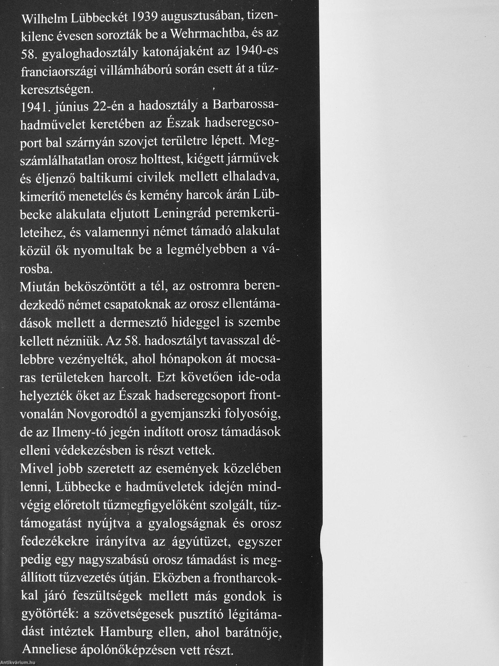 Dávid B. Hurt közreműködésével Wilhelm Lübbecke a háboni idején írott feljegyzései, levelei, a zsoldkönyve, a hadosztály történetéről szóló történeti munka, legfőképpen pedig saját emlékei felhasználásával papírra vetette négyéves frontszolgálata tapasztalatait. A győzelmekről és a katasztrófáról szóló, első kézből származó hiteles leírásaival a Leningrád kapujában páratlan betekintést nyújt a keleti fronton vívott harcok mindennapi valóságába.