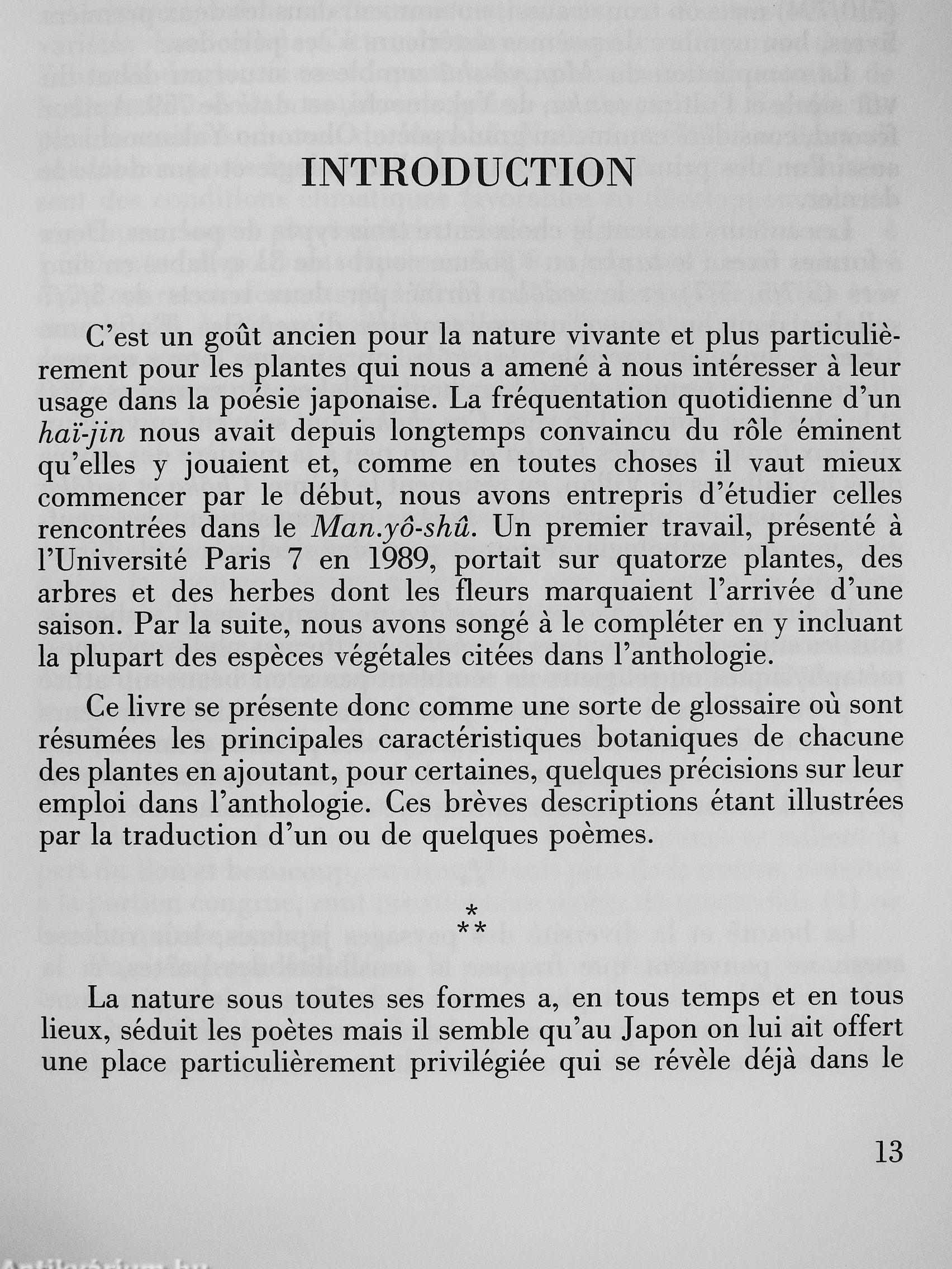 Ces plantes, certaines homologues aux nôtres ou déja acclimatées et d'autres, exotiques et encore inconnues sous nos climats, font ici l'objet d'une breve description botanique suivie par la traduction d'un ou de plusieurs des poemes ou elles figurent