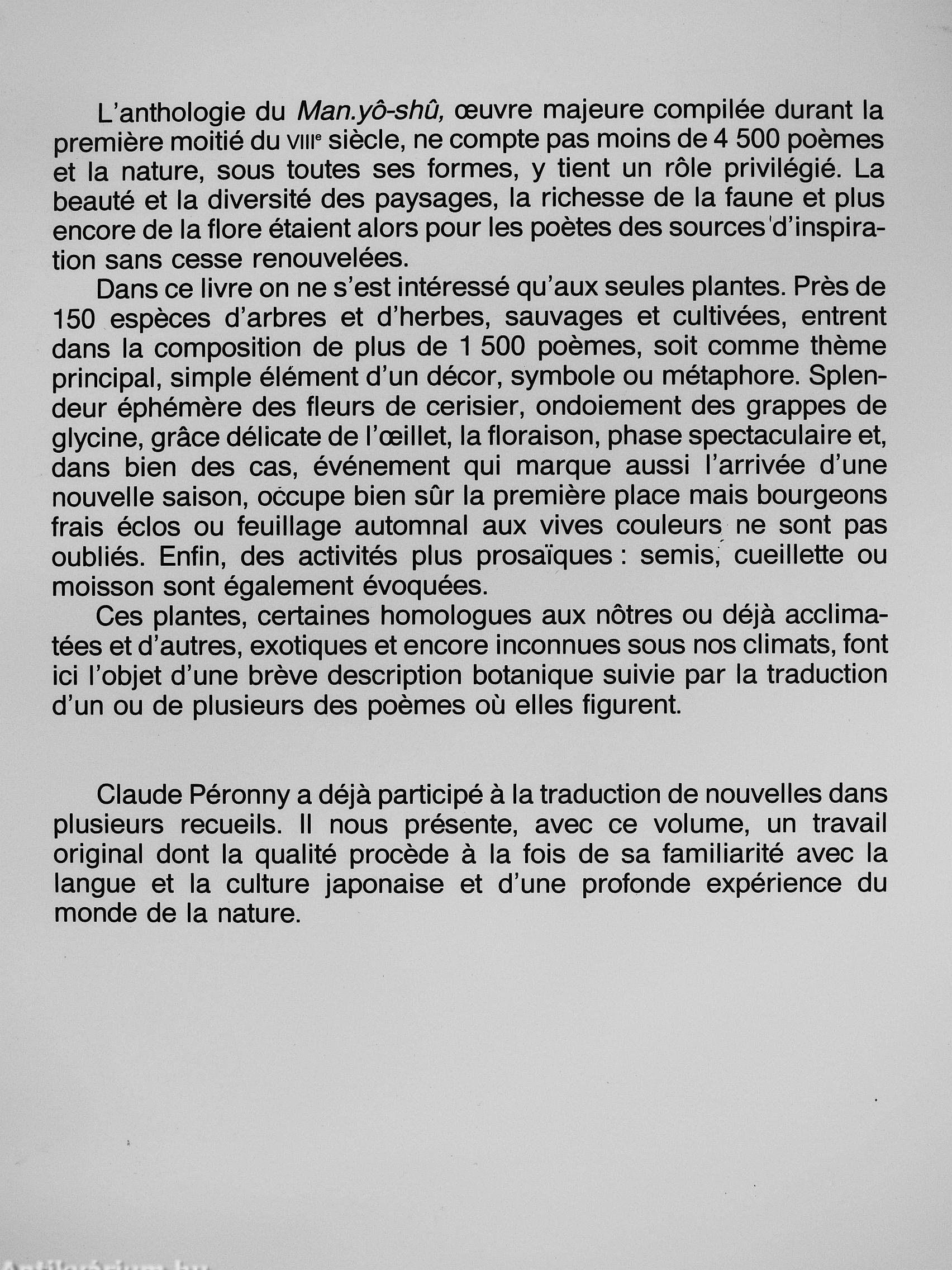 Dans ce livre on ne s'est intéressé qu'aux seules plantes. Pres de 150 especes d'arbres et d'herbes, sauvages et cultivées, entrent dans la composition de plus de 1 500 poemes, soit comme theme principal, simple élément d'un décor, symbole ou métaphore. Splendeur éphémere des fleurs de cerisier, ondoiement des grappes de glycine, grâce délicate de l'oillet, la floraison, phase spectaculaire et, dans bien des cas, événement qui marque aussi l'arrivée d'une nouvelle saison, occupe bien sur la premiere place mais bourgeons frais éclos ou feuillage automnal aux vives couleurs ne sont pas oubliés. Enfin, des activités plus prosaiques : semis, cueillette ou moisson sont également évoquées.