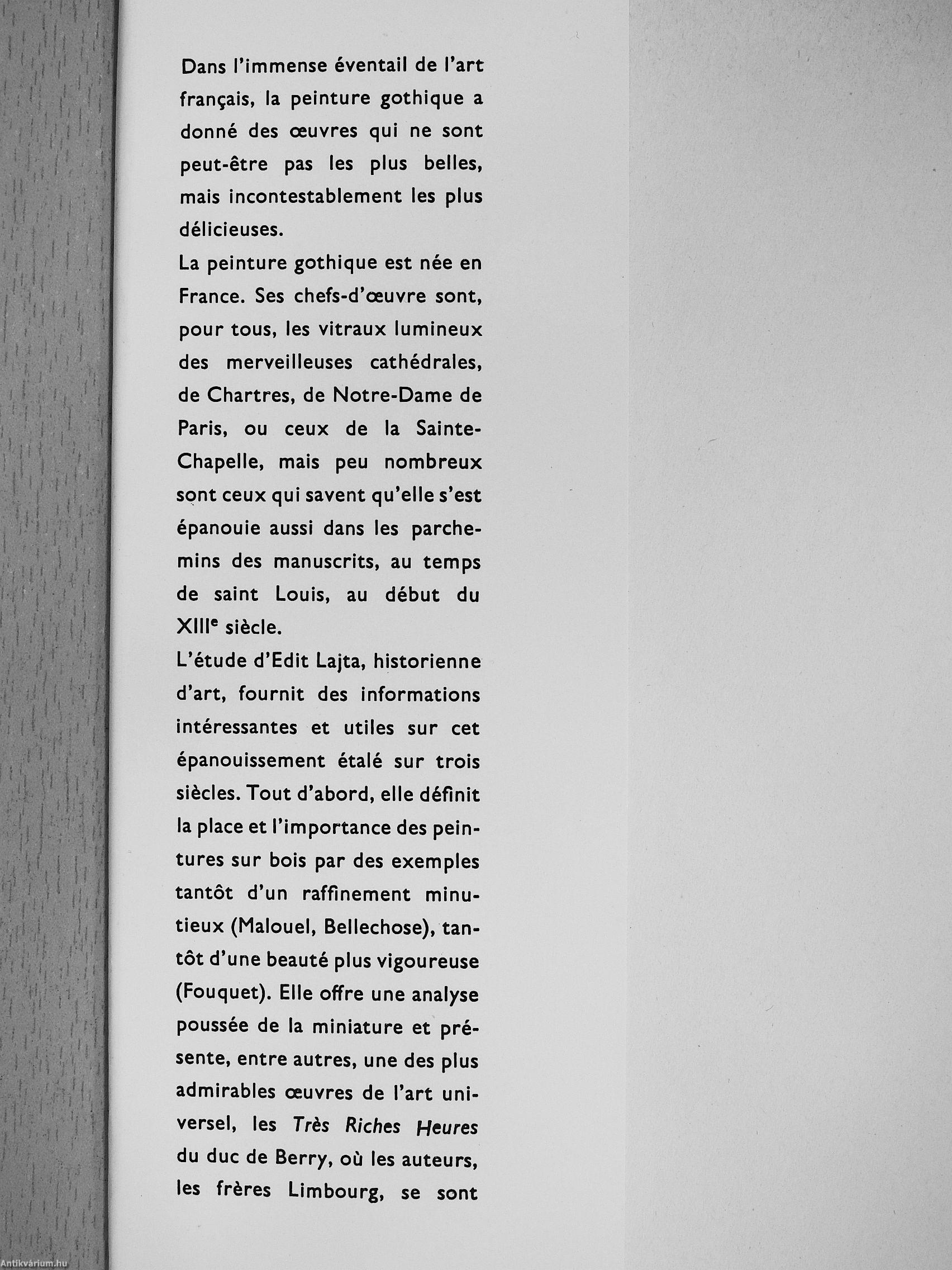 L'étude d'Edit Lajta, historienne d'art, fournit des informations intéressantes et utiles sur cet épanouissement étalé sur trois siecles. Tout d'abord, elle définit la place et l'importance des peintures sur bois par des exemples tantôt d'un raffinement minutieux (Malouel, Bellechose), tantôt d'une beauté plus vigoureuse (Fouquet). Elle offre une analyse poussée de la miniature et présente, entre autres, une des plus admirables ouvres de l'art universel, les Tres Riches Heures du duc de Berry, ou les auteurs, les freres Limbourg, se sont