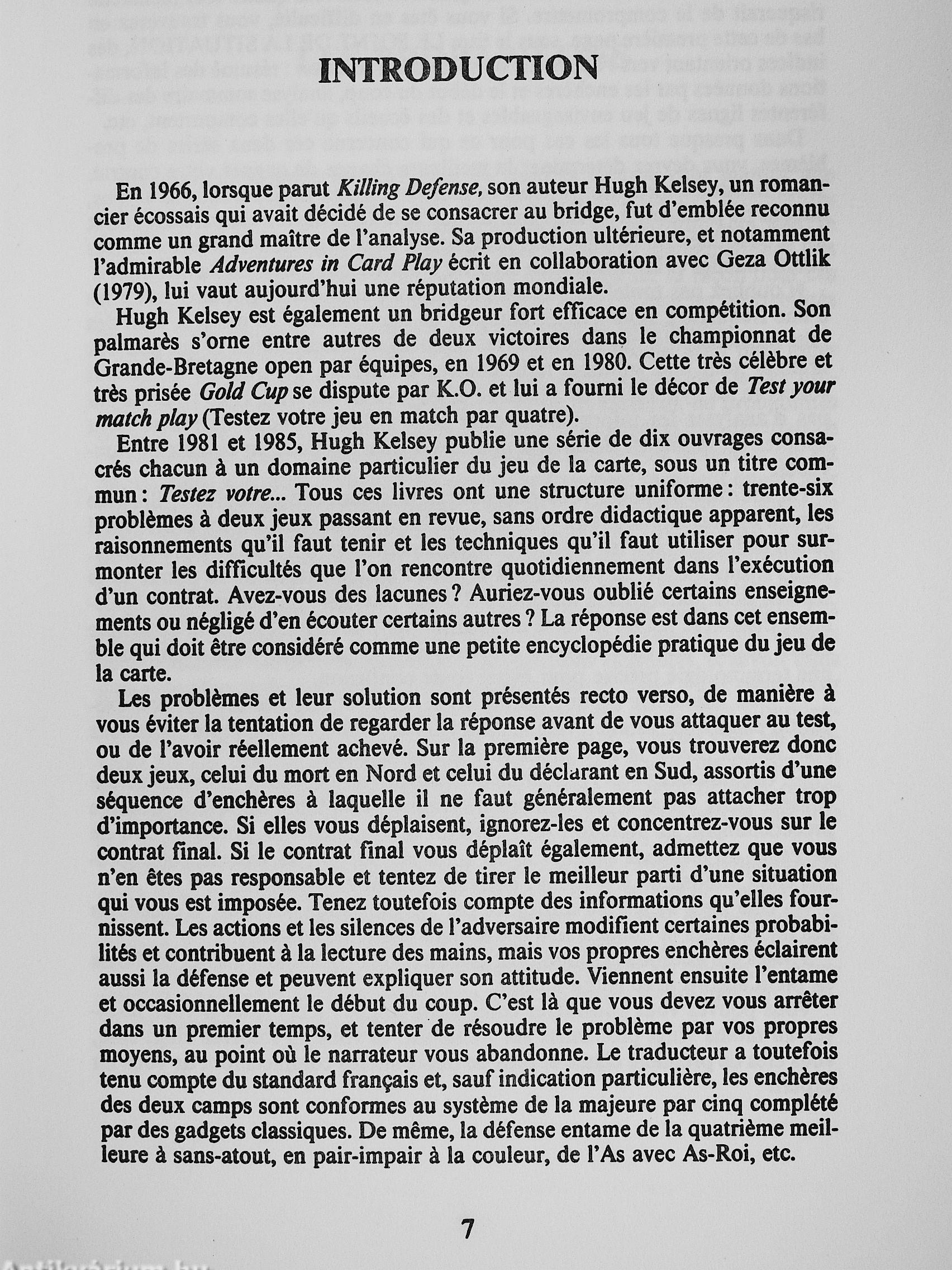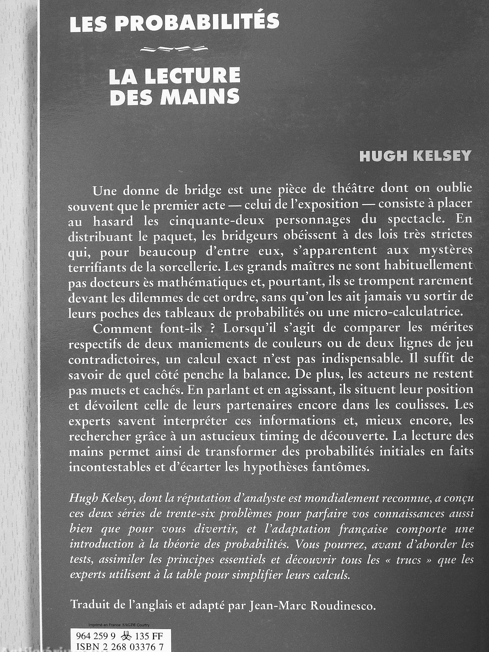 Hugh Kelsey, dont la réputation d'analyste est mondialement reconnue, a conçu ces deux séries de trente-six problemes pour parfaire vos connaissances aussi bien que pour vous divertir, et l'adaptation française comporte une introduction a la théorie des probabilités. Vous pourrez, avant d'aborder les tests, assimiler les principes essentiels et découvrir tous les « trucs » que les experts utilisent a la table pour simplifier leurs calculs.