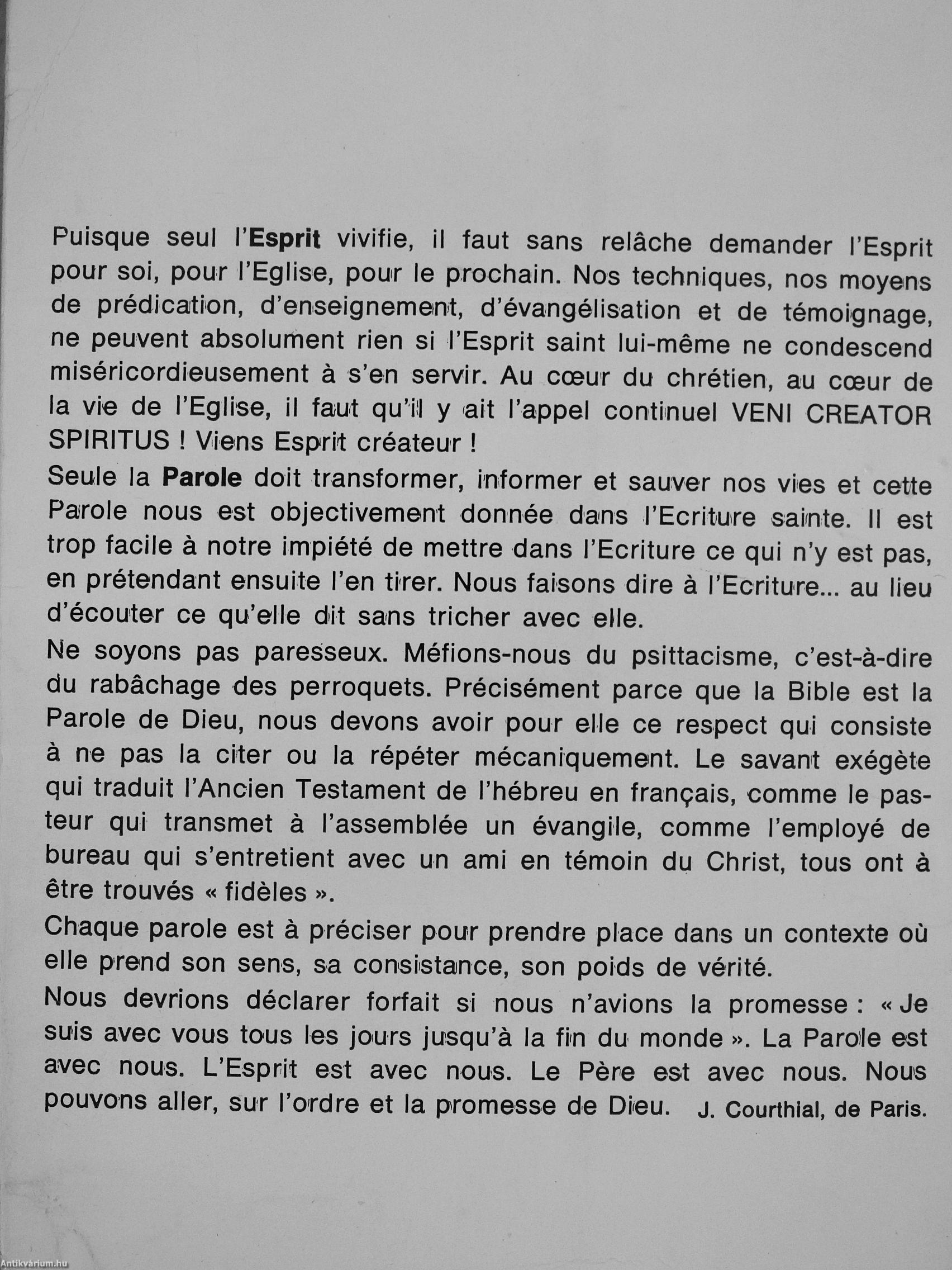 Seule la Parole doit transformer, informer et sauver nos vies et cette Parole nous est objectivement donnée dans l'Ecriture sal'nte. Il est trop facile a notre impiété de mettre dans l'Ecriture ce qui n'y est pas, en prétendant ensuite l'en tirer. Nous faisons dire a l'Ecriture au lieu d'écouter ce qu'elle dit sans tricher avec elle. Ne soyons pas paresseux. Méfions-nous du psittacisme, c'est-a-dire du rabâchage des perroquets. Précisément parce que la Bible est la Parole de Dieu, nous devons avoir pour elle ce respect qui consiste a ne pas la citer ou la répéter mécaniquement. Le savant exégete qui traduit l'Ancien Testament de l'hébreu en français, comme le pasteur qui transmet a l'assemblée un évangile, comme l'employé de bureau qui s'entretient avec un ami en témoin du Christ, tous ont a etre trouvés « fideles ».