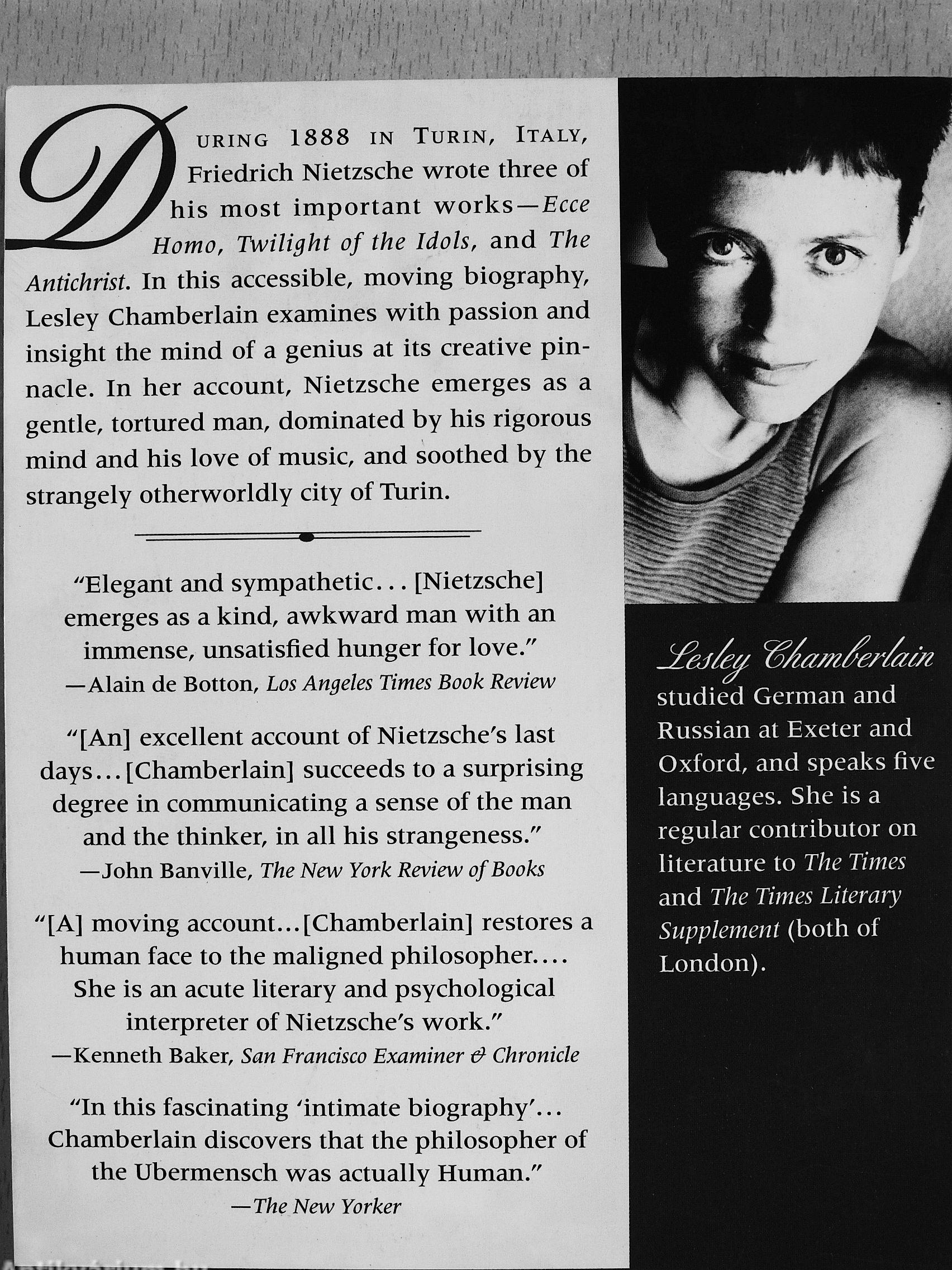 uring 1888 in Turin, Italy, Friedrich Nietzsche wrote three of his most important works—Ecce Homo, Twilight of the Idols, and The Antichrist. In this accessible, moving biography, Lesley Chamberlain examines with passion and insight the mind of a genius at its creative pinnacle. In her account, Nietzsche emerges as a gentle, tortured man, dominated by his rigorous mind and his love of music, and soothed by the strangely otherworldly city of Turin.