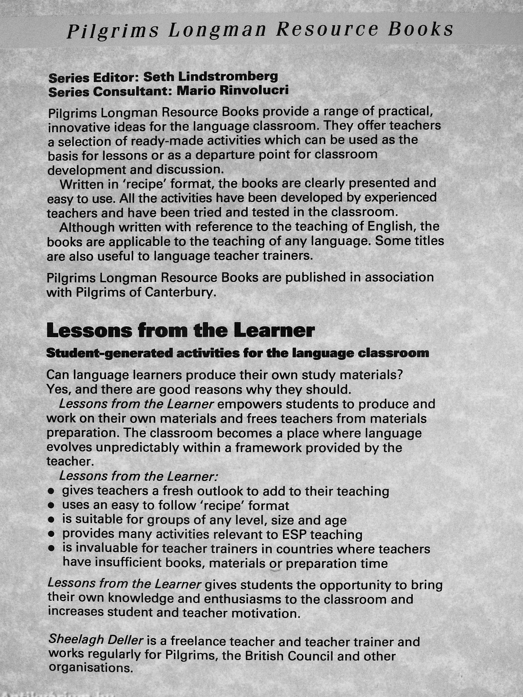 Pilgrims Longman Resource Books provide a range of practical, innovative ideas for the language classroom. They offer teachers a selection of ready-made activities which can be used as the basis for lessons or as a departure point for classroom development and discussion.