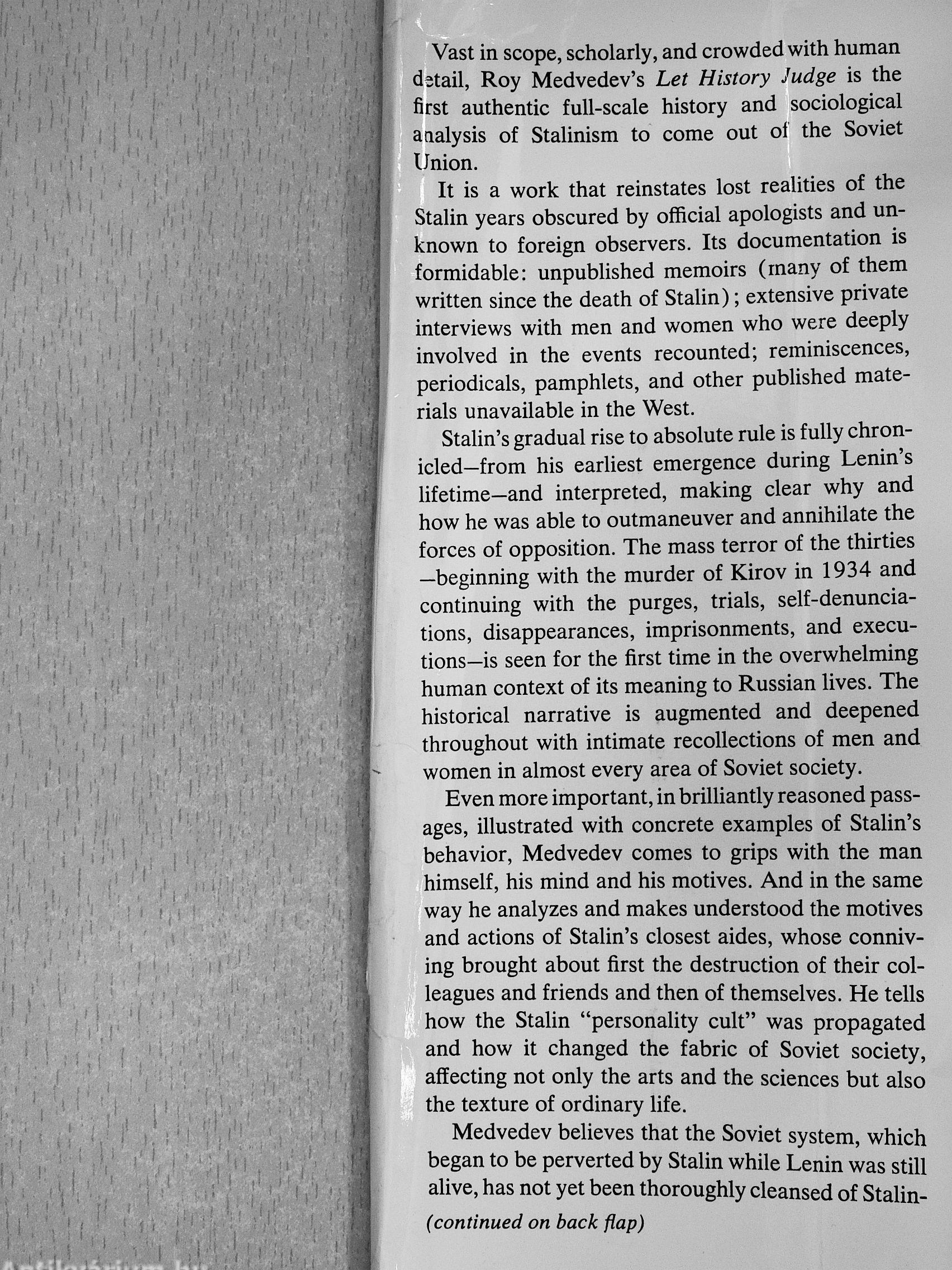 Medvedev believes that the Soviet system, which began to be perverted by Stalin while Lenin was still alive, has not yet been thoroughly cleansed of Stalin-(continued on back flap)