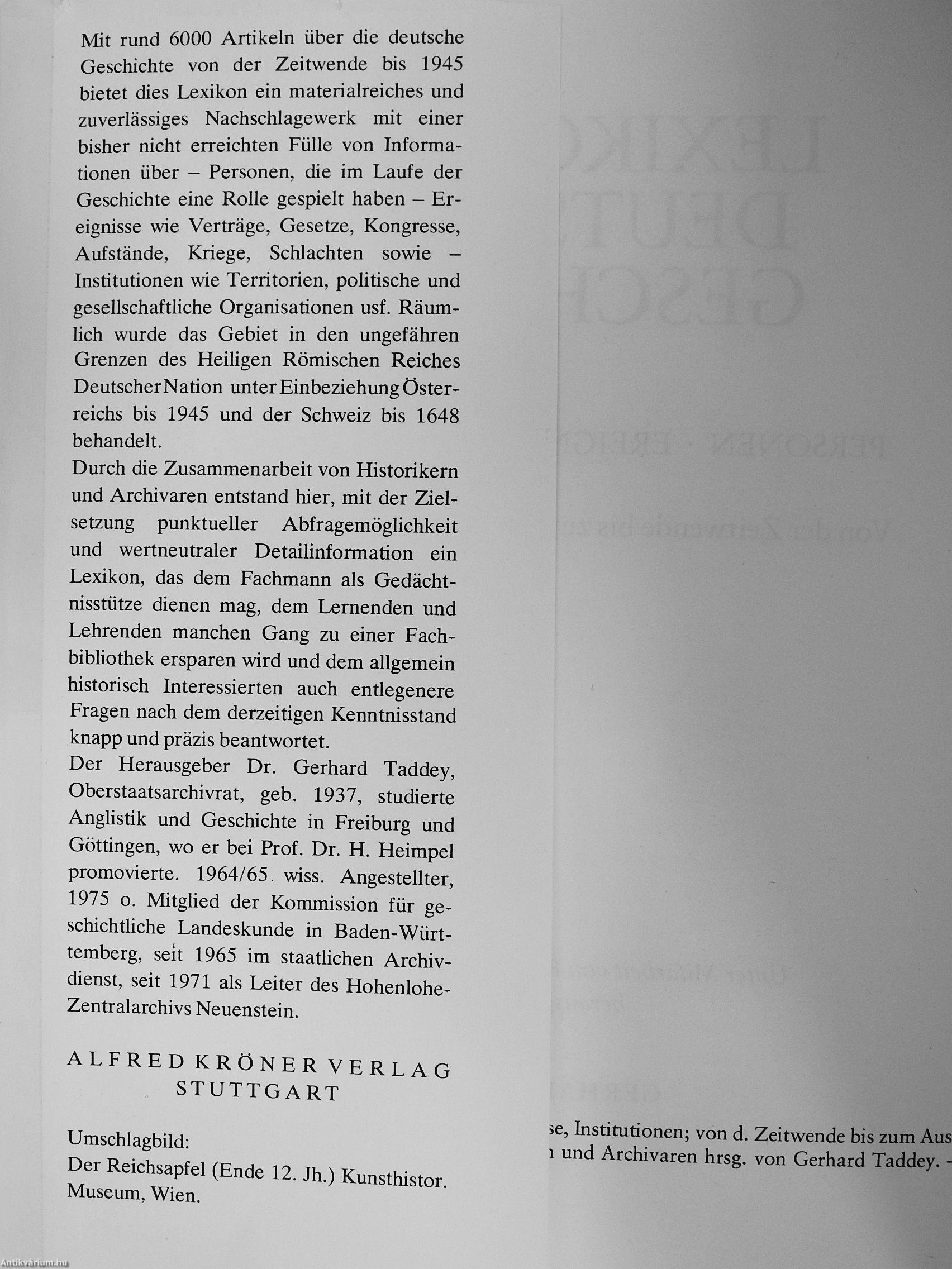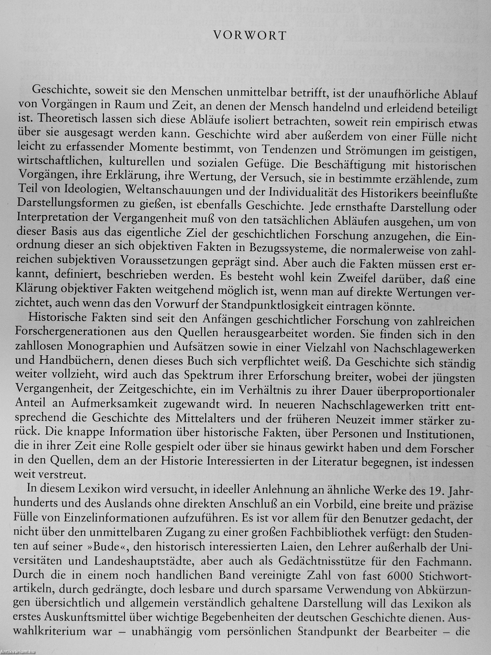 Durch die Zusammenarbeit von Historikern und Archivaren entstand hier, mit der Zielsetzung punktueller Abfragemöglichkeit und wertneutraler Detailinformation ein Lexikon, das dem Fachmann als Gedächtnisstütze dienen mag, dem Lernenden und Lehrenden manchen Gang zu einer Fach-bibhothek ersparen wird und dem allgemein historisch Interessierten auch entlegenere Fragen...