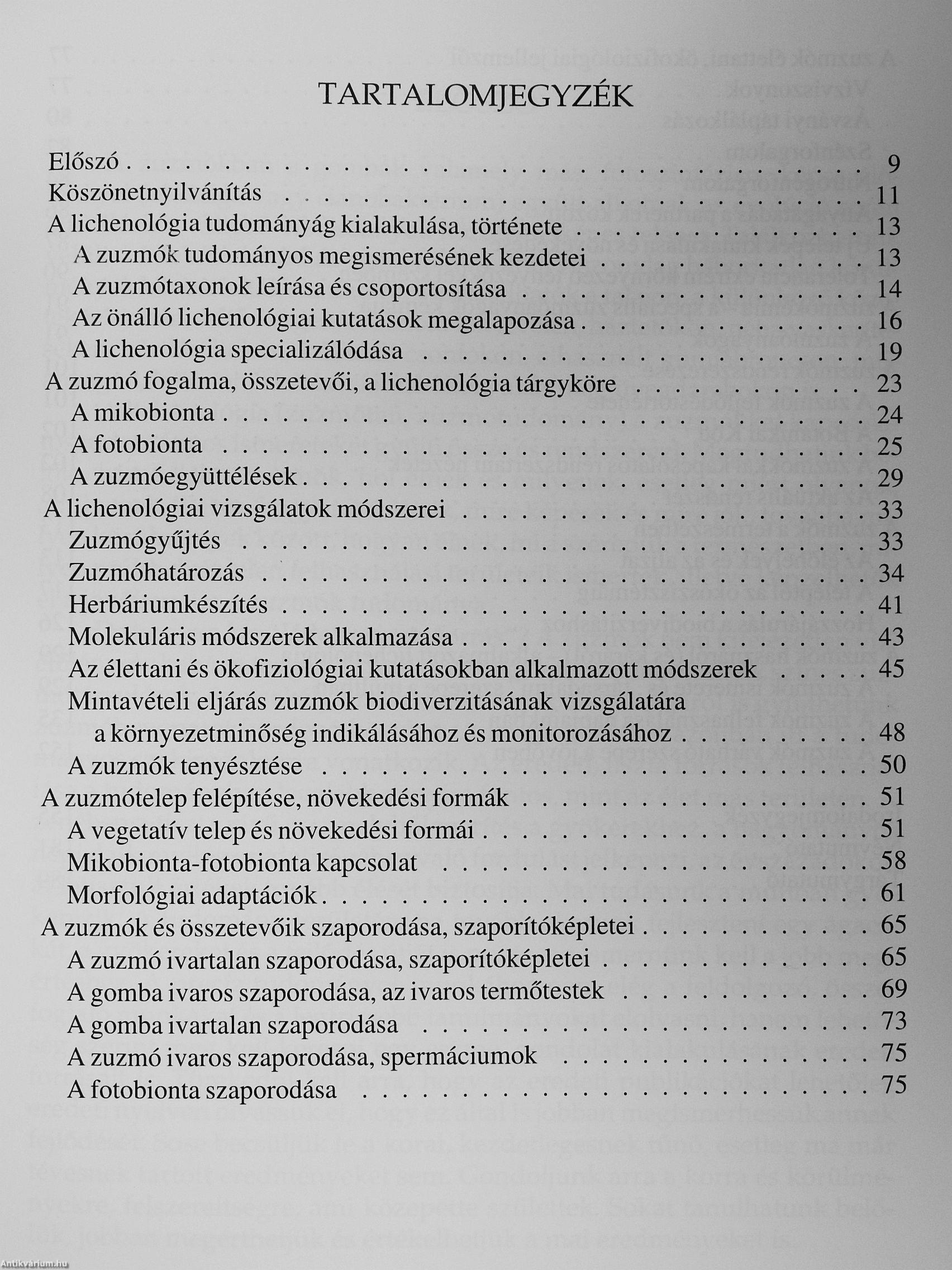 tory Museum, London). Rövidebb lichenológiai tanulmányutakat töltött Ausztriá- * I ban, Csehországban, Észtországban, Finnországban, Hollandiában, Kanadában, j Kubában, Lettországban, Németországban,- Romániában, Szlovákiában, Tanzá- j niában, Ukrajnában, valamint a skandináv államokban. Két alkalommal kapta J í meg 3-3 évre a Bolyai jános Kutatási Ösztöndíjat (1998, 2004). Elsősorban a 1 : kéregtelepű zuzmókhoz kötődő kutatásait (a levegőszennyezettség bioindikáció- 1 ¦ ja, trópusi levéllakó zuzmók taxonómiája, magyarországi zuzmók taxonómiai, í i florisztikai és konzervációbiológiai kutatása) 1991 óta az Országos Tudományos \ i Kutatási Alapprogramok pályázatai támogatják. Az ELTÉ-n „A lichenológia alapjai" ® című kurzust vezeti, hallgatói köziii többen készítettek és jelenleg is készítenek li- i ; chenológiai témában szakdolgozatot, illetve egyetemi doktori disszertációt. Több -F hazai és nemzetközi tudományos bizottság és társaság tagja és tisztségviselője (az ; MTA Botanikai Bizottság titkára: 1993-1999, 2005-, az lAL Nemzetközi Lichenológiai Szövetség vezetőségi tagja: 1996-2000). _