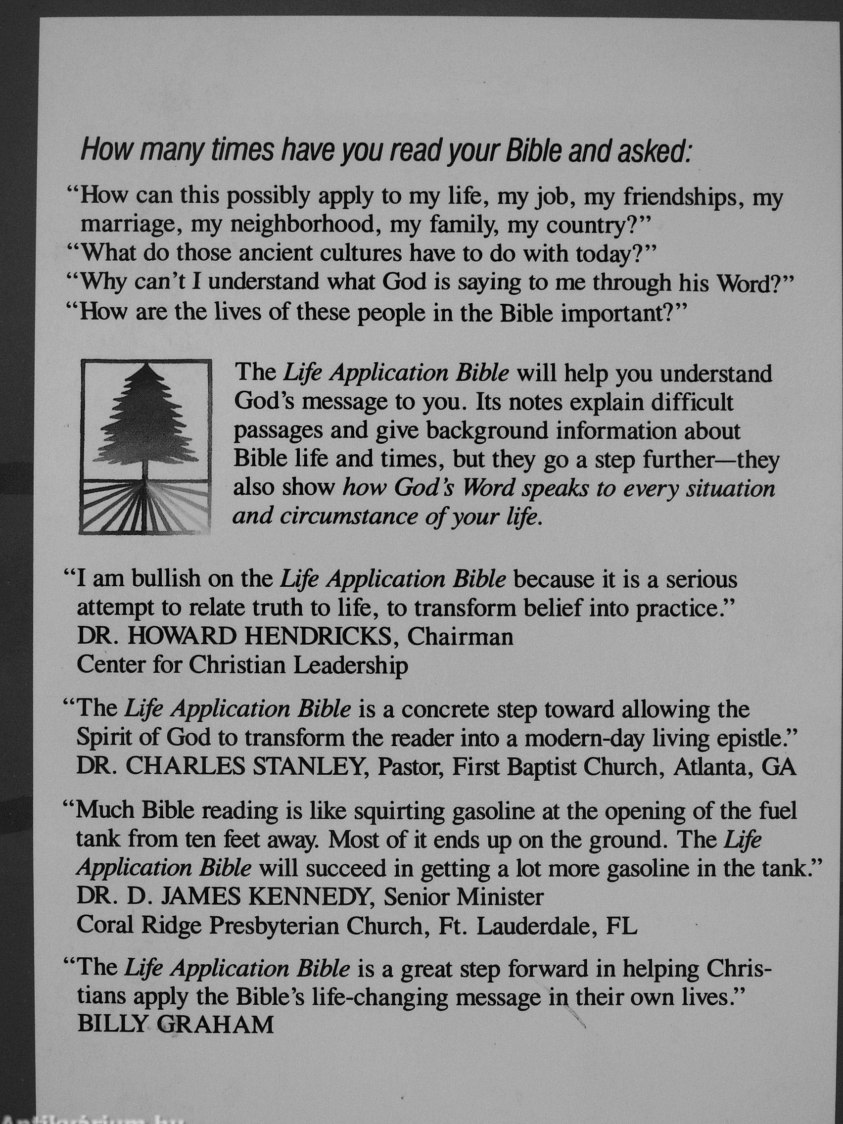 'Much Bible reading is like squirting gasoline at the opening of the fiiel tank from ten feet away. Most of it ends up on the ground. The Life Application Bible will succeed in getting a lot more gasoline in the tank.' DR. D. JAMES KENNEDY, Senior Minister Coral Ridge Presbyterian Church, Ft. Lauderdale, FL